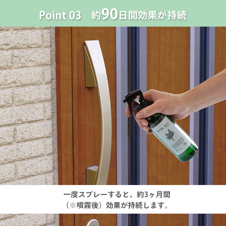 ・約90日間効果が持続:一度スプレーすると、約3ヶ月間(※噴霧後)効果が持続します。