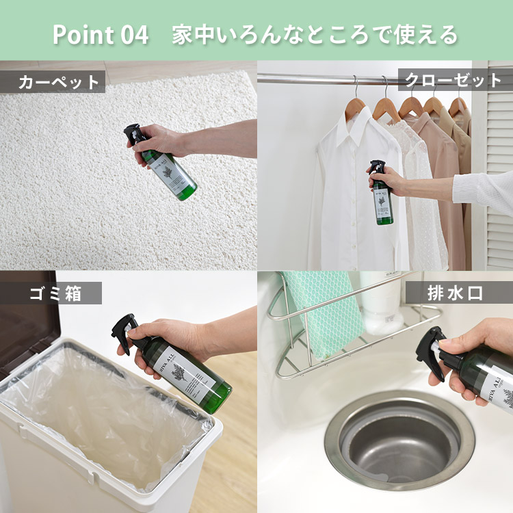 ・家中で使える:布団、カーペット、網戸、クローゼット、ぬいぐるみ、ゴミ箱、排水口など、様々な場所にスプレーするだけで虫対策ができます。