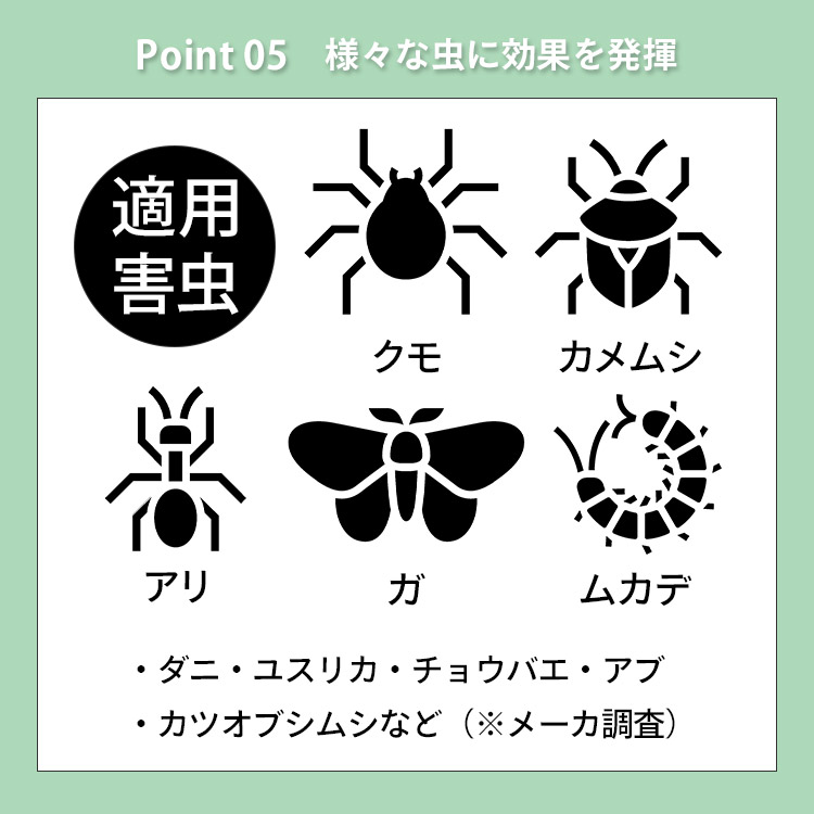 ・様々な虫に効果を発揮:クモ、ダニ、ユスリカ、チョウバエ、ガ、アブ、カメムシ、アリ、ムカデ、カツオブシムシなど、幅広い害虫に忌避効果があります。
