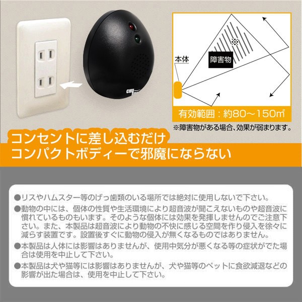 ※動物の中には、個体の性質や生活環境により超音波が聞こえないものや超音波に慣れているものもいます。そのような個体には効果を発揮しませんのでご注意ください。また、本製品は超音波により動物の不快に感じる空間を作侵入を徐々に減らす装置です。設置後すぐに動物の侵入がなくなるものではありません。