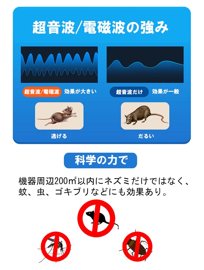 超音波 害虫駆除 ねずみ駆除 電磁波 害虫駆除 200平方メートル 広範囲カバー 日本語説明書 鼠 ゴキブリ 蚊 蟻 蜘蛛 コウモリ 駆除 子供やペットに安心 送料無料
