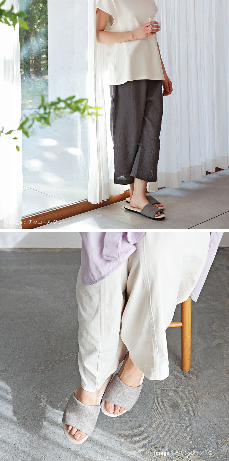 コットンならではのやわらかな風合いと、リネンのシャリ感、両方を味わっていただける、天然素材の優しい履き心地です。