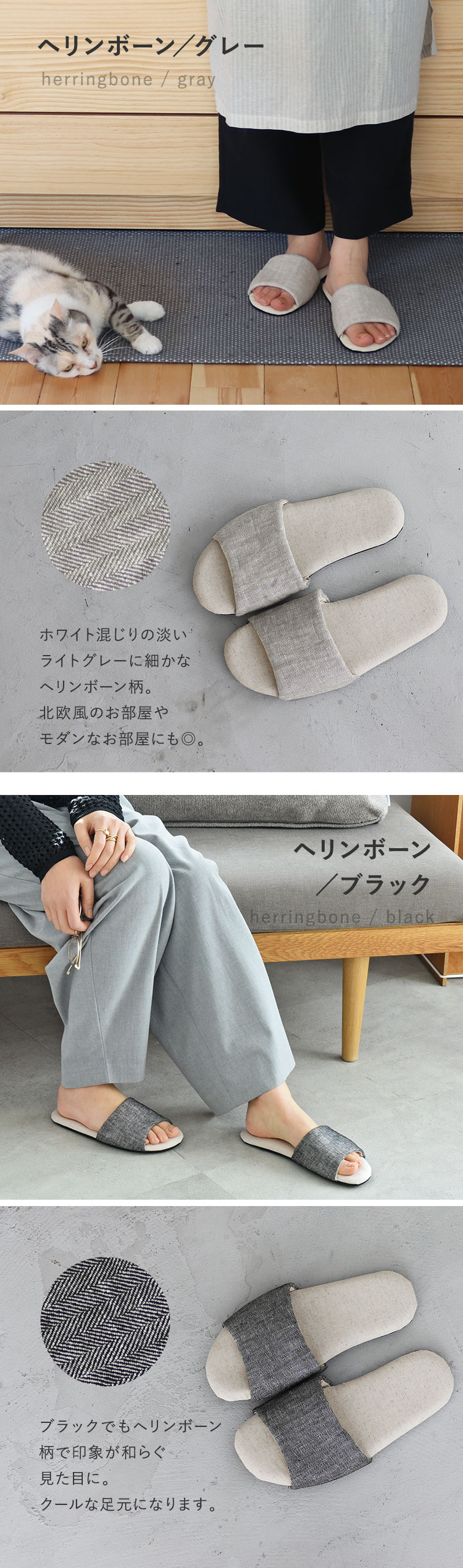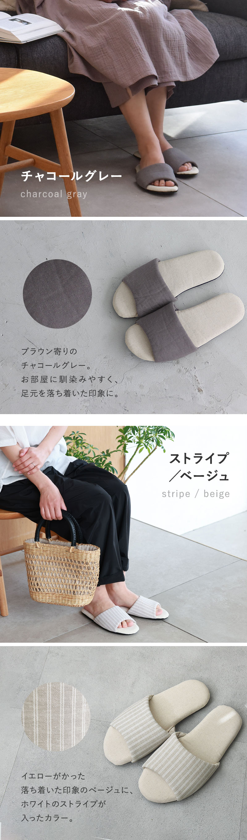 暑い時期のスリッパのお悩みである「蒸れ」。bon moment (ボンモマン)のリネンスリッパは、全体がさらりと気持ちの良いコットンリネン素材。さらに、つま先が開いたカタチで蒸れを防いでくれるので、素足で気持ち良く履けるスリッパです。
