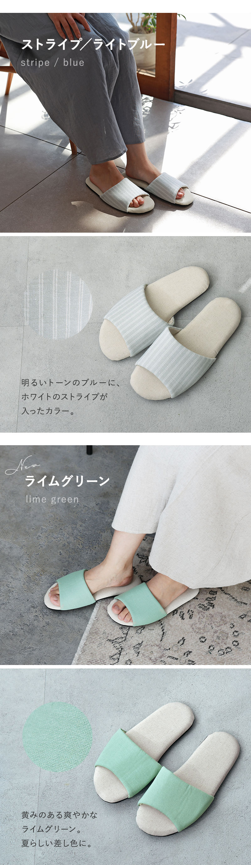 夏らしく爽やかで、見ていると元気が出てくるようなライムグリーン。昨年まで展開していたカラーとも合わせやすいものを選んでいるので、お手持ちのスリッパの買い足しにも◎。