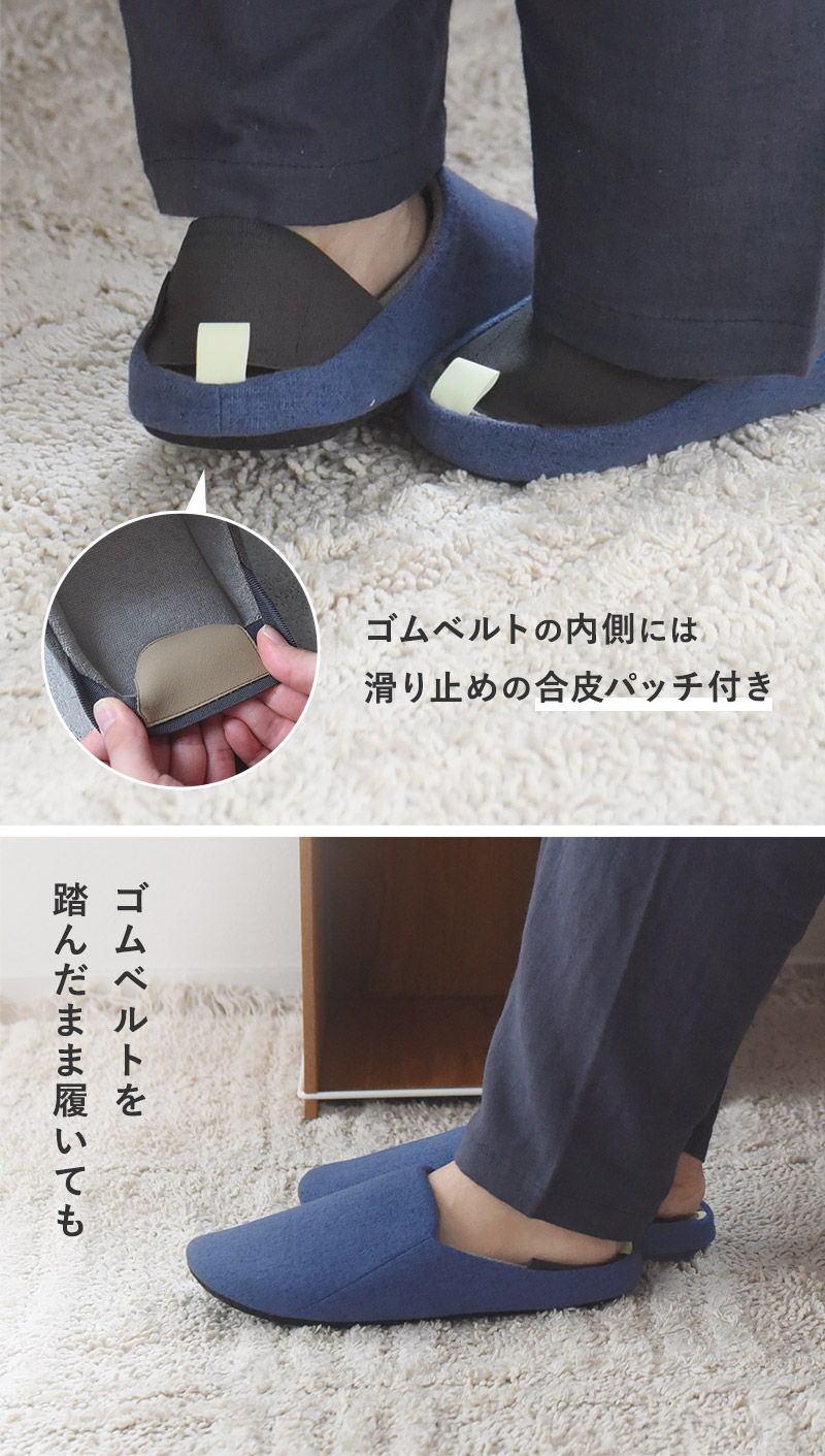 かかとにはゴムベルトが付いており、脱げにくいのもポイント。ゴムベルトの裏側に合皮パッチが縫い付けてあり、滑りにくい仕様になっています。インソールに綺麗に収まるので、普段履くときは、踏んだまま履いてもOK。