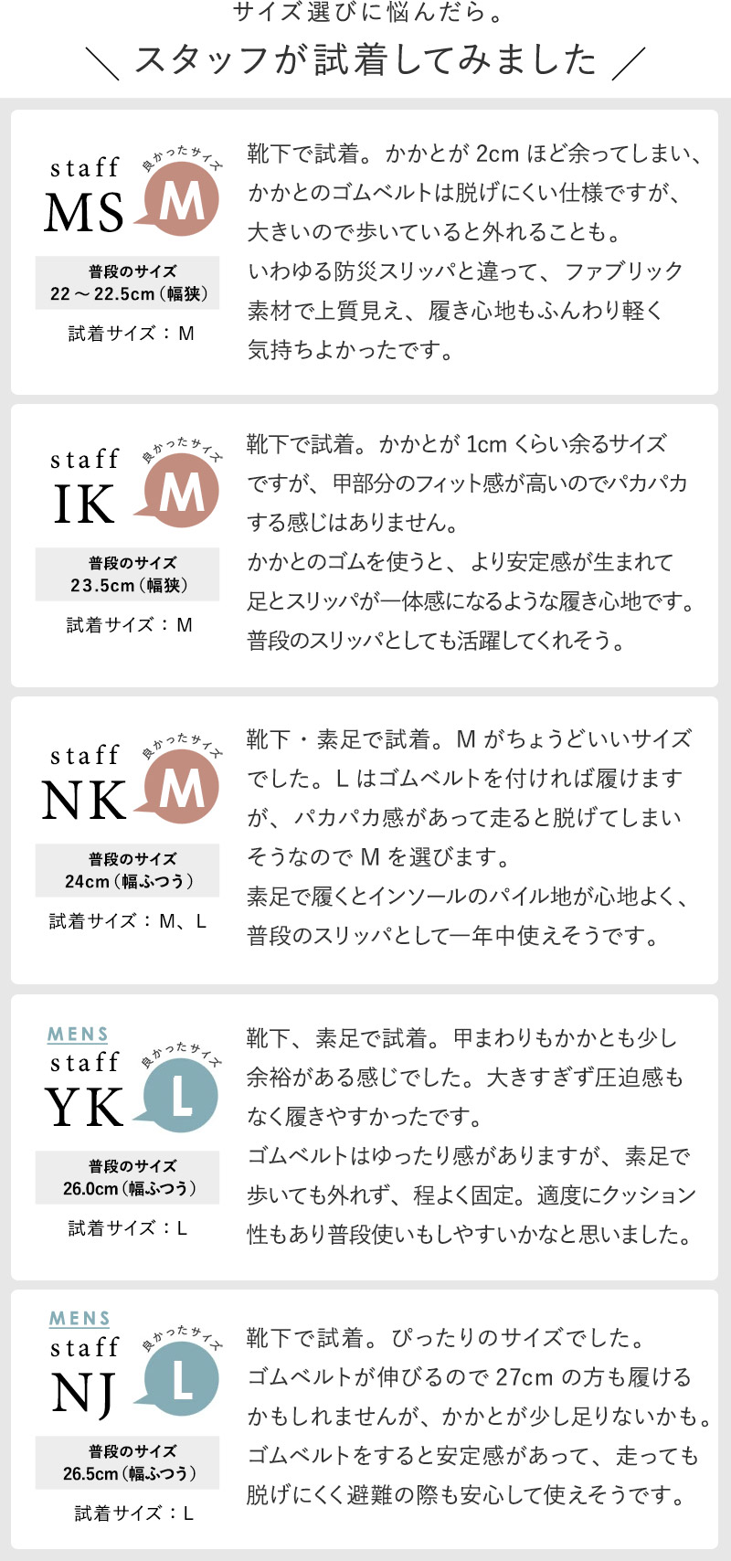 商品詳細いざという時の備えに、日常的に履けるデザインで足元をしっかり守るスリッパが登場。釘やガラスの貫通を防ぐ防災シート入りで、第三者機関の踏み抜き防止検査実施済のスリッパです。SPECsize: