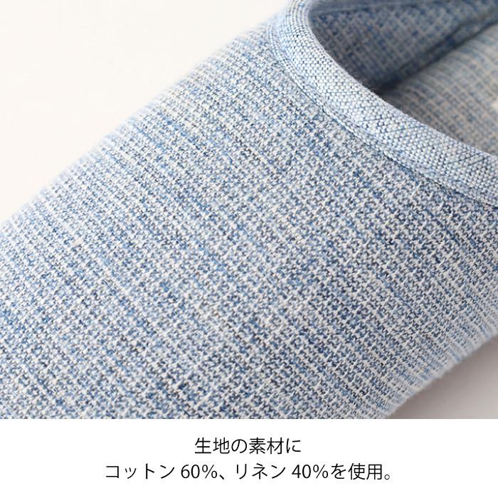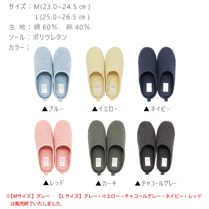 商品名:ルームシューズ スリッパ 夏 麻 洗える 軽量 タオル コットン 日本製 今治産(MOKUリネン ルームシューズ)◎履き口の端がかかと付近までつながっているチャールズ型。足にフィットして脱げにくいのが特長です。◎生地の素材にコットン60%、リネン40%使用。べたつきのない爽やかな肌ざわり。◎暑い季節には、素足で履くのもおすすめです。◎底部分にはポリウレタンを使用。パタパタと音が鳴りにくいです。◎ネットに入れてお洗濯可能。清潔にお使いいただけます。◎かかとにループがついているので、吊り下げて干すことができます。◎インテリアに合わせたり、家族で色違いにしたりと色選びをお楽しみいただけます。商品名:MOKU Linen モクリネン ルームシューズ生産国:日本製(今治)サイズ:Mサイズ(23〜24.5cm) Lサイズ(25〜26.5cm)素材:生地:綿60% リネン40%ソール:ポリウレタンカラー:ブルー・イエロー・レッド・ネイビー・カーキ・チャコールグレー※【Mサイズ】グレー 【Lサイズ】グレー・イエロー・チャコールグレー・ネイビー・レッドは販売終了いたしました。※お使いのモニター設定、お部屋の照明等により実際の商品と色味が異なる場合がございます。