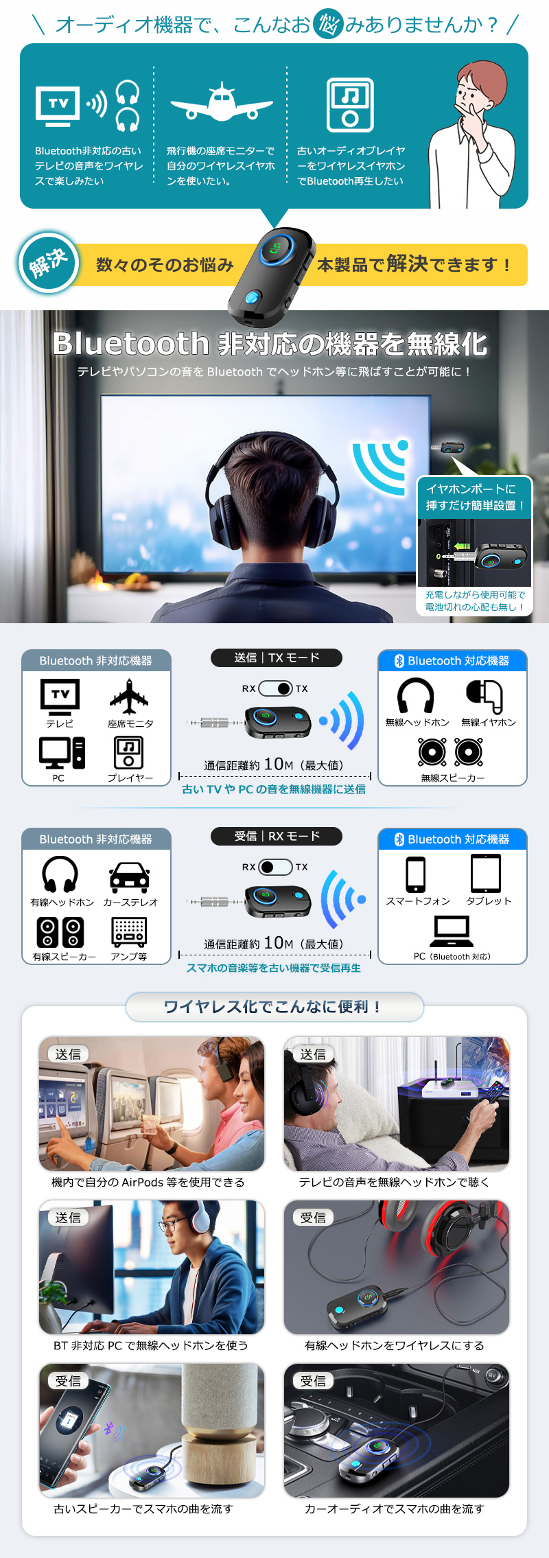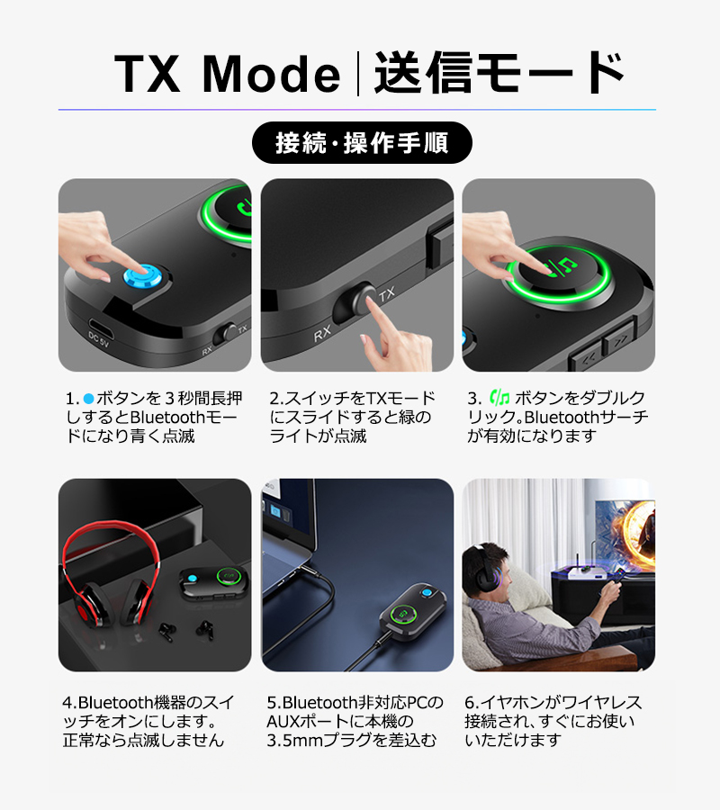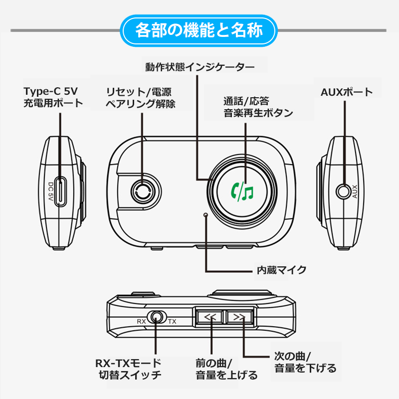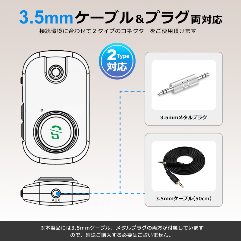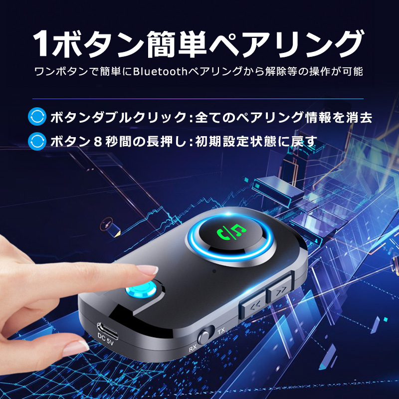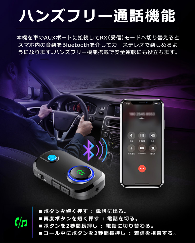 ■Bluetooth機能をオーディオ機器に追加最新のBluetooth 5.3を搭載したトランスミッター&レシーバーアダプター。即時ペアリングが可能で、低消費電力ながら長距離で安定したワイヤレス伝送と、よりクリアな音声を向上させます。飛行機の座席モニター、テレビ、ノートPC、ジムのランニングマシーンなどのBluetooth非対応デバイスでも、イヤホンジャックがあれば本製品を接続するだけで簡単にBluetooth機能を追加してワイヤレス化。AirPodsやブルートゥース対応のイヤホン、ヘッドホンで音楽鑑賞ができます。■送信モード&受信モード切替可能トランスミッターとレシーバー両方の機能を備えており、スイッチ一つでTX(送信)とRX(受信)の切替が可能です。■簡単接続プラグアンドプレイに対応しており、ペアリングも簡単にできます。■3.5mmオーディオポートAUXオーディオ出力ポートにヘッドホンやイヤホンケーブルを接続可能 付属のメタルプラグを装着してカーステレオに接続できます。■ハンズフリー通話で安全運転を実現ハンズフリー通話が可能。音楽の再生/一時停止、前の曲、次の曲、通話の応答/切断/拒否、通話のリダイヤルのボタンが付いていて、簡単操作で運転中も安心です。■ゲームをワイヤレスでNintendo Switch等のゲーム機のAUXポートにBluetooth送信機挿入しボタンを押すことで Bluetoothイヤホンとペアリングして音を送信します。■最大19時間の長時間使用TXモードでは最長で約19時間の使用が可能な充電式バッテリーを内蔵(RXモードでは最長で約14時間)。小型軽量ポータブルなうえ環境に優しく省エネも実現します■小型軽量で海外旅行に最適小さくて軽い、重さわずか17.5g。海外旅行にも最適なポータブルBluetoothアダプターです。■2台同時接続に対応デュアルリンク接続に対応。ヘッドホンやイヤホンを2台同時に繋げ好きな映画や音楽ポッドキャストを同じ座席の仲間と共有できます。■約10Mの長距離伝送車内の使用だけでなく、自宅の広いリビングルームでの使用も適しているため、自宅のステレオシステム/スピーカー/有線イヤホンにBluetoothを追加し、ワイヤレスで音楽を受信して楽しむことができます。■幅広い使用方法飛行機内の座席モニターに本製品を設置しAirPodsやBluetooth対応のワイヤレスヘッドホンで快適に映画や音楽を高音質でお楽しみ頂けます。 また、3.5mmオーディオプラグが付属しているので、古いスピーカーやステレオと互換性があります。 スマートフォンからBluetooth非対応の古いステレオに音楽をストリーミングすることもできます。車載、カーナビ、ボートの他、風呂場に設置されたスピーカーで入浴しながら音楽を聴くのにも適しています。---------------------------------------------------------------オーディオインターフェース:3.5mm AUX対応オーディオフォーマット:MP3 / WMA / WAV/ APE / FLAC / SBC転送距離:約10mバッテリー:TX(送信)モード:最長約19時間/RX(受信)モード:最長約14時間)本体サイズ:6.5 x 3.9 x 1.6 cmパッケージ内容:Bluetoothトランスミッターレシーバー/USB充電ケーブル/3.5mmオーディオケーブル/3.5mmメタルプラグ/取扱説明書