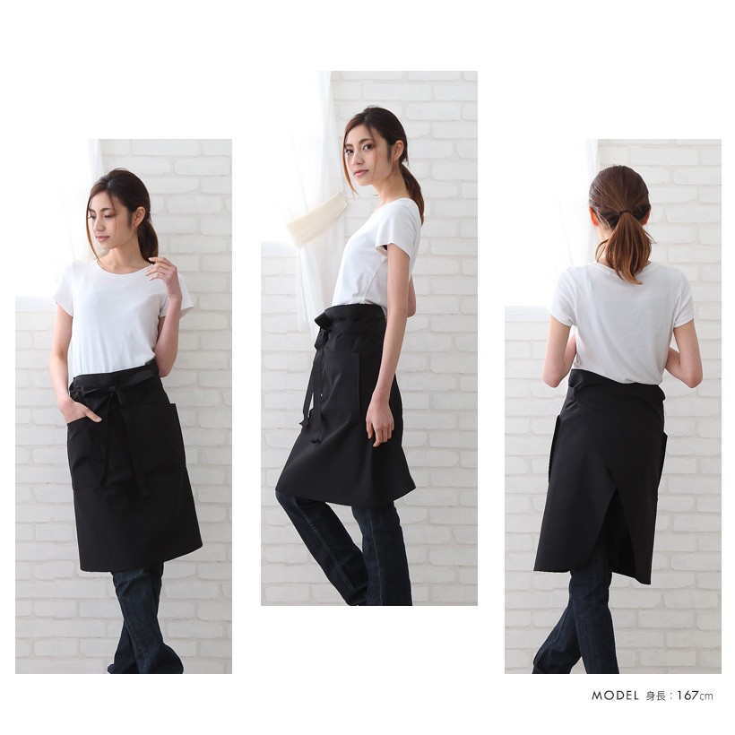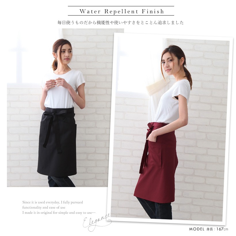 水や汚れに強く、しわになりくくお手入れしやすい業務用カフェエプロン。 腰紐はほどけにくく女性の体形にフィットするようなカーブ形状。お尻がすっきり隠れ、後ろ姿を気にすることなく、動きやすい。さらっとした生地でしわになりくく、体にフィットするので、着心地がよくて快適です。