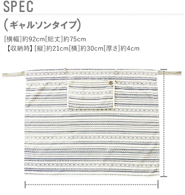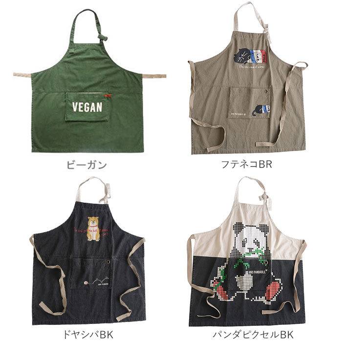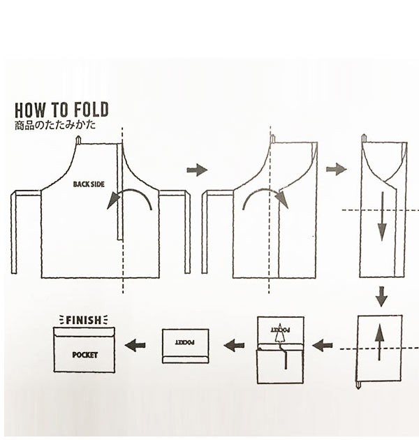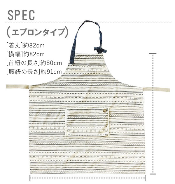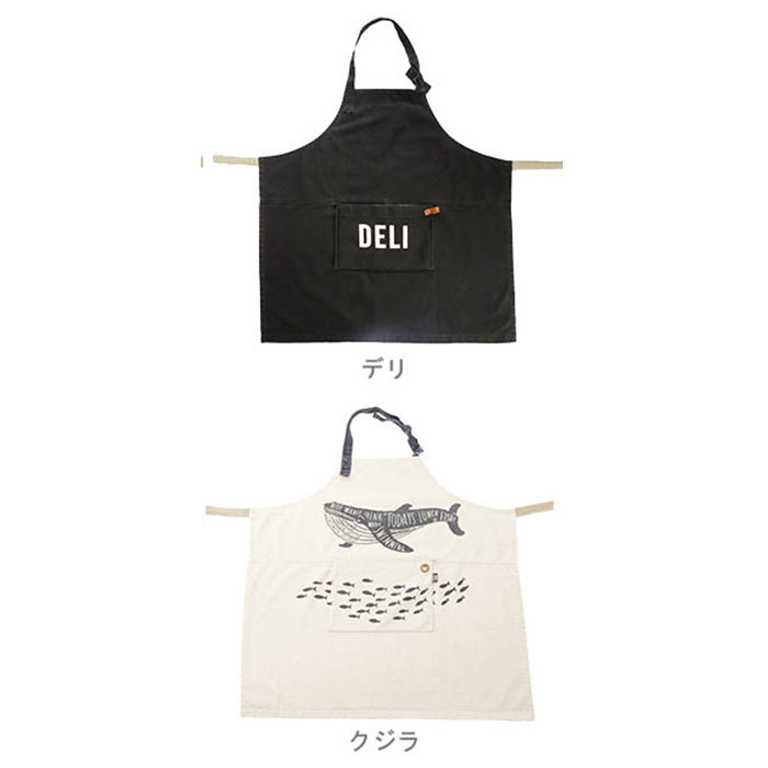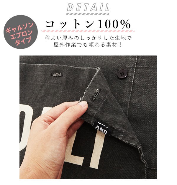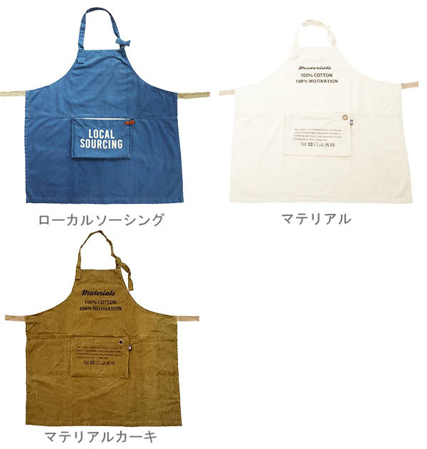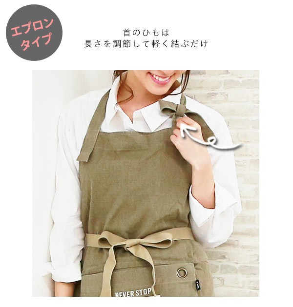しっかりとした丈夫なデニム生地の風合いがおしゃれ。エプロンタイプは折りたたんで前部のポケットに収納できます。首のひもは、長さを調節して軽く結ぶだけ。