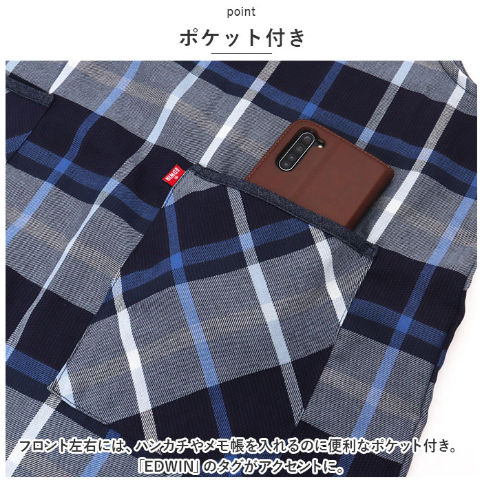 ・フロント左右には、ハンカチやメモ帳を入れるのに便利なポケット付き。「EDWIN」のタグがアクセントに。