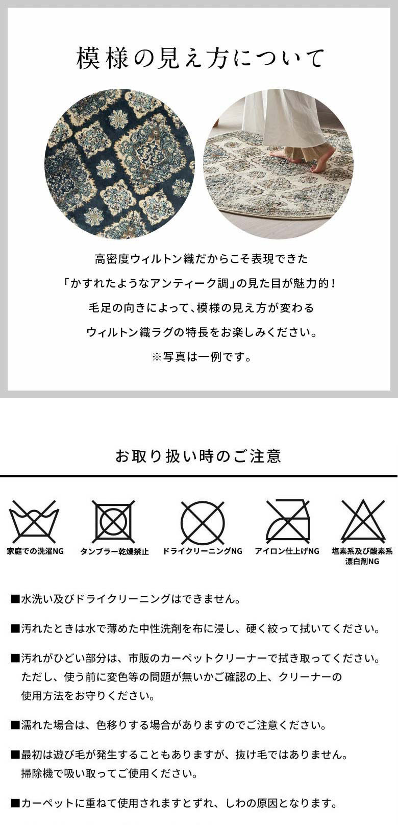ウィルトン織ラグとプリントラグ。その違いは一目瞭然!安価なプリントラグは、毛先にのみ模様をプリントしているため、毛足が寝たり摩耗したりすると、柄がかすれて薄くなることがあります。一方、ウィルトン織ラグは、色付きのパイル糸を組み合わせて模様を作るため、発色が美しく色褪せにくいのが特徴です。さらに、光の当たり方や見る角度によって陰影が生まれ、立体感のある美しいデザインを楽しめます。