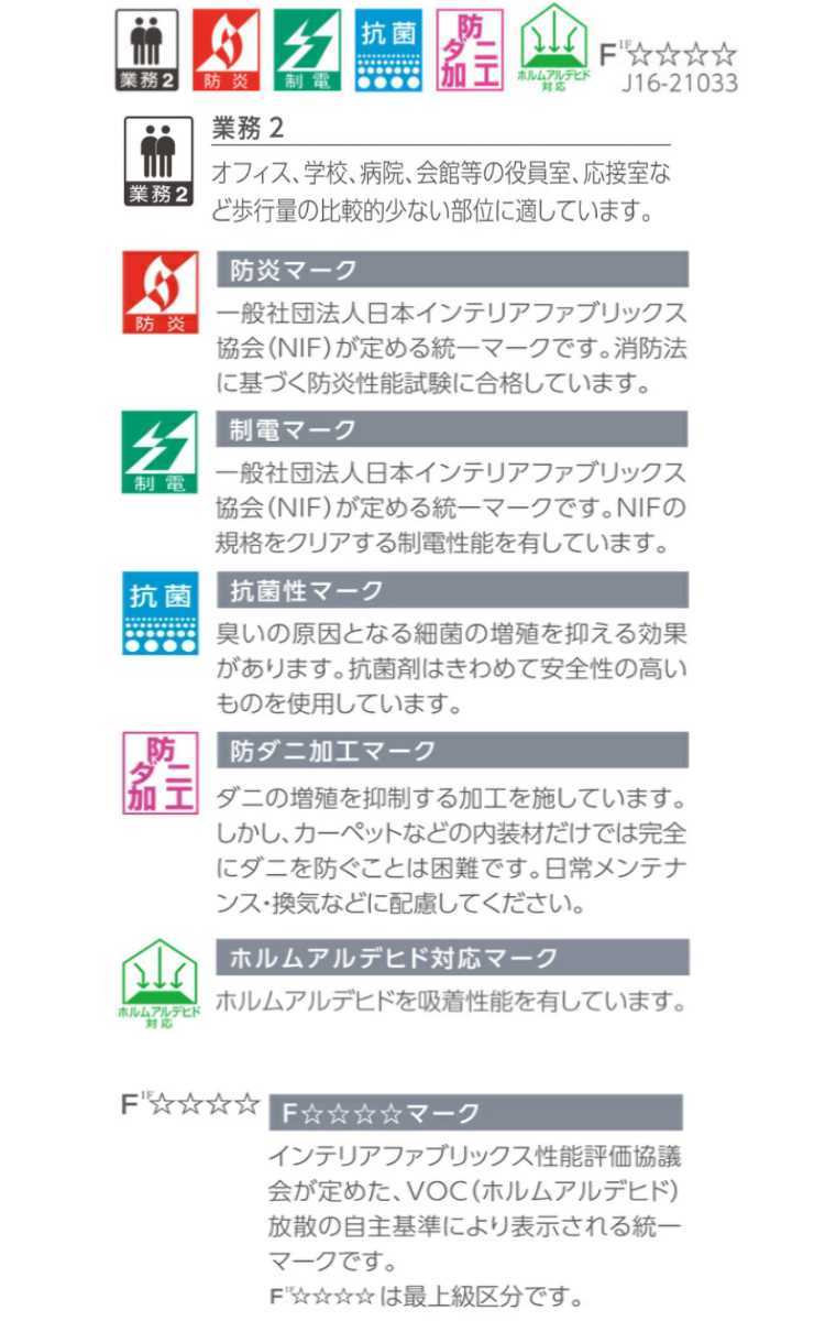 ホルムアルデヒド放散等級:インテリアファブリックス性能評価協議会認定(認定番号 J16-21033)