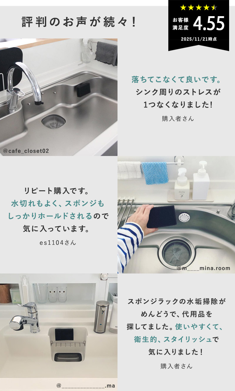 シンクに直接触れることなくホールドされるから、水アカも溜まりにくく衛生的です。浮かせていることで、シンクのお掃除も楽ちん。