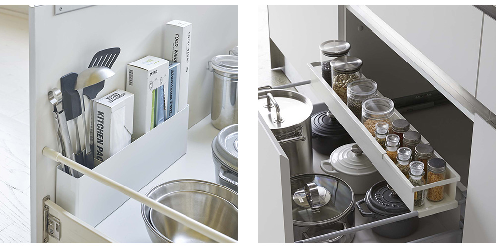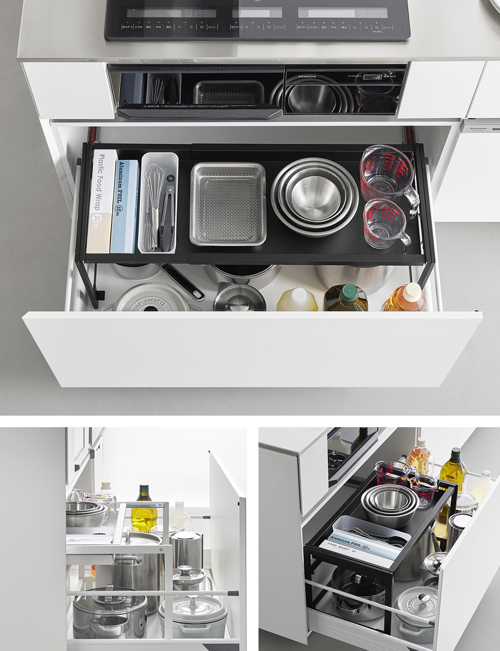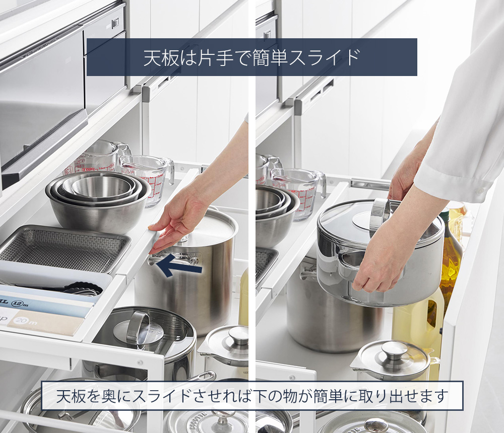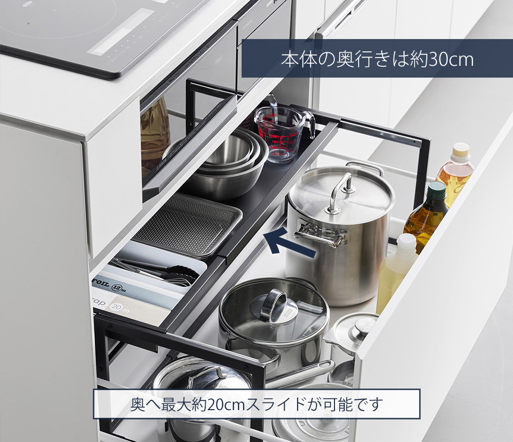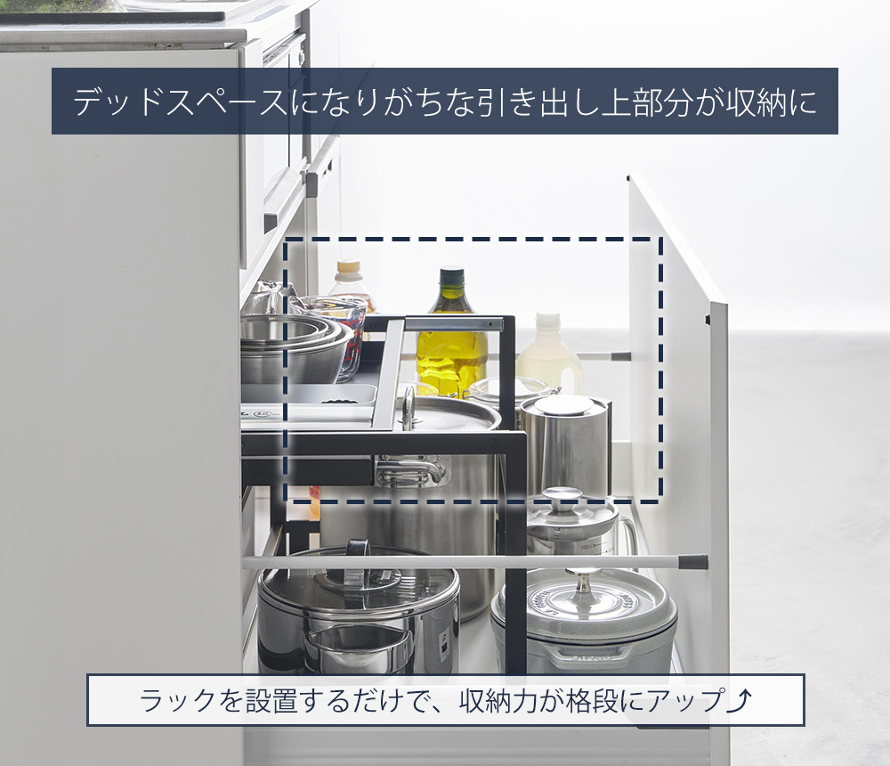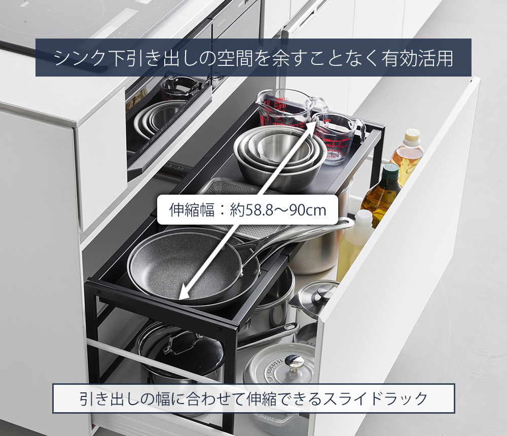 シンク下の引き出しにお鍋やフライパン、調理器具を重ねて収納すると下の物を取るときに大変。引き出しの上部分に収納を作って引き出しの空間を余すことなく有効活用できるスライドラックが登場です。おうちの引き出しに合わせて伸縮幅約58.8〜90cmで調整が可能です。