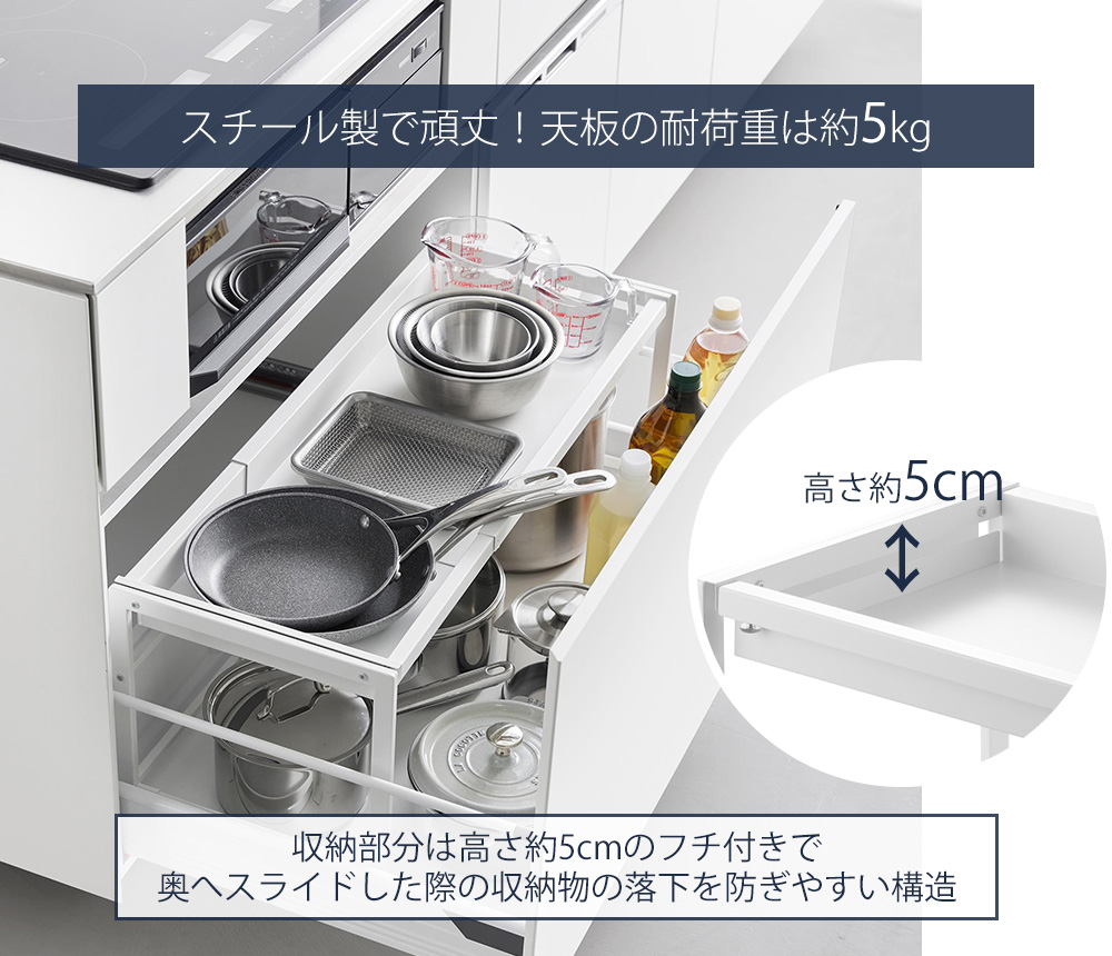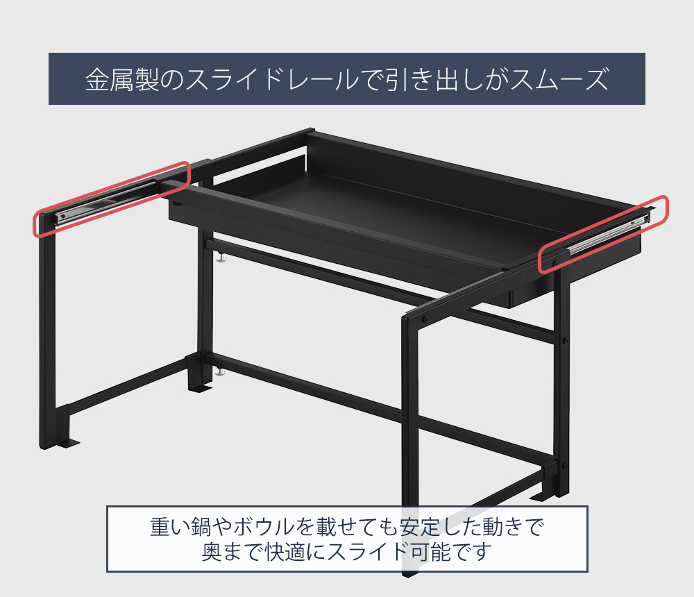 金属製のスライドレールで引き出しがスムーズ。重い鍋やボウルを載せても安定した動きで、奥まで快適にスライドできます。