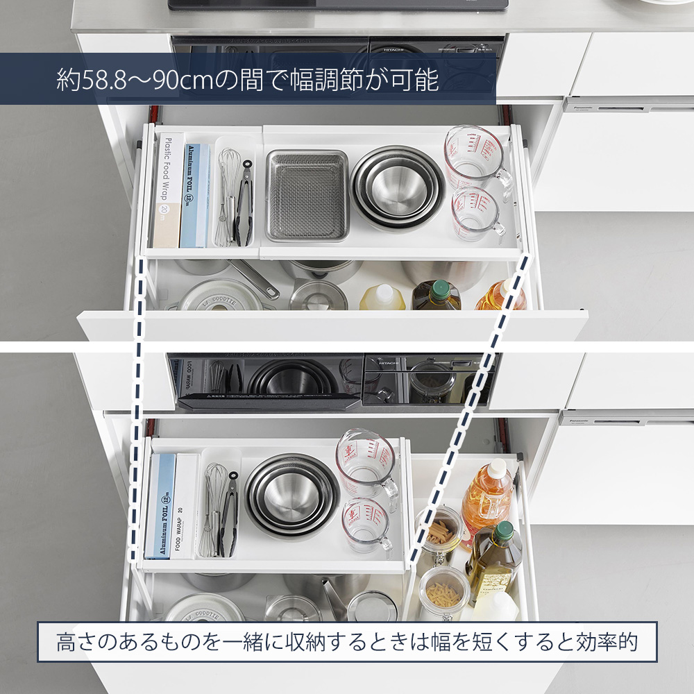 おうちの引き出しや、引出しに収納する物に合わせて約58.8〜90cmの間で幅調節が可能。瓶やペットボトルなど高さのあるものを一緒に収納するときは幅を短く、背の低いものを収納するときは幅を広げるなど効率的に使用できます。