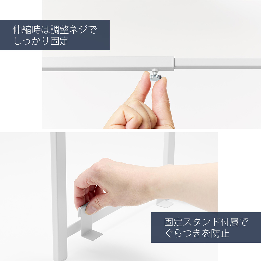 伸縮は無段階で調節可能で、調整ネジでお好みの幅にしっかりと固定できます。固定スタンドとシールが付属し、ラックのぐらつきも防止できます。※・シンク下引き出しの底面など、接地面に粘着テープが張り付くことをご確認のうえ、設置してください。