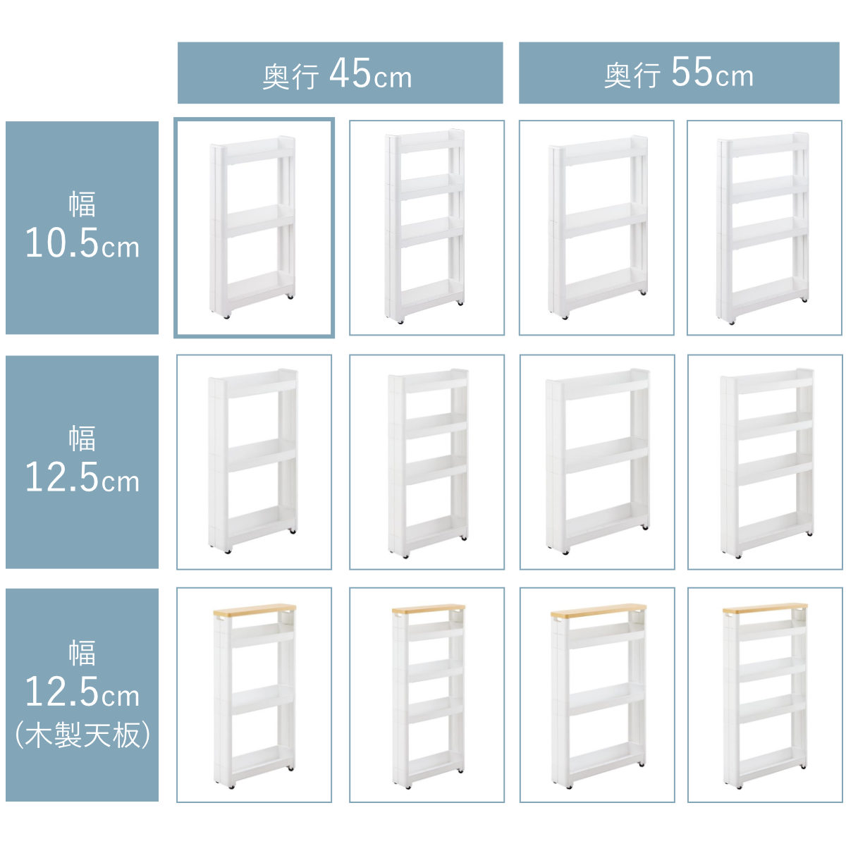 ご家庭の隙間にぴったり合うように幅・奥行・天板のタイプの中から全部で12通りの豊富なサイズ展開をご用意しています。使う場所や収納したい物に合わせてお好みのサイズをお選びください。
