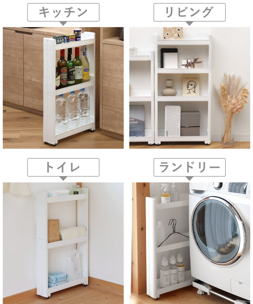洗面所では、洗濯機や洗面台の横の隙間に置いて洗剤やタオルの収納に。トイレでは、ペーパーホルダーラックとしても使えます。プラスチック製で水に濡れてもサッと拭けるからお掃除も簡単。リビングでは、壁面に沿わせてディスプレイラックとして使えます。