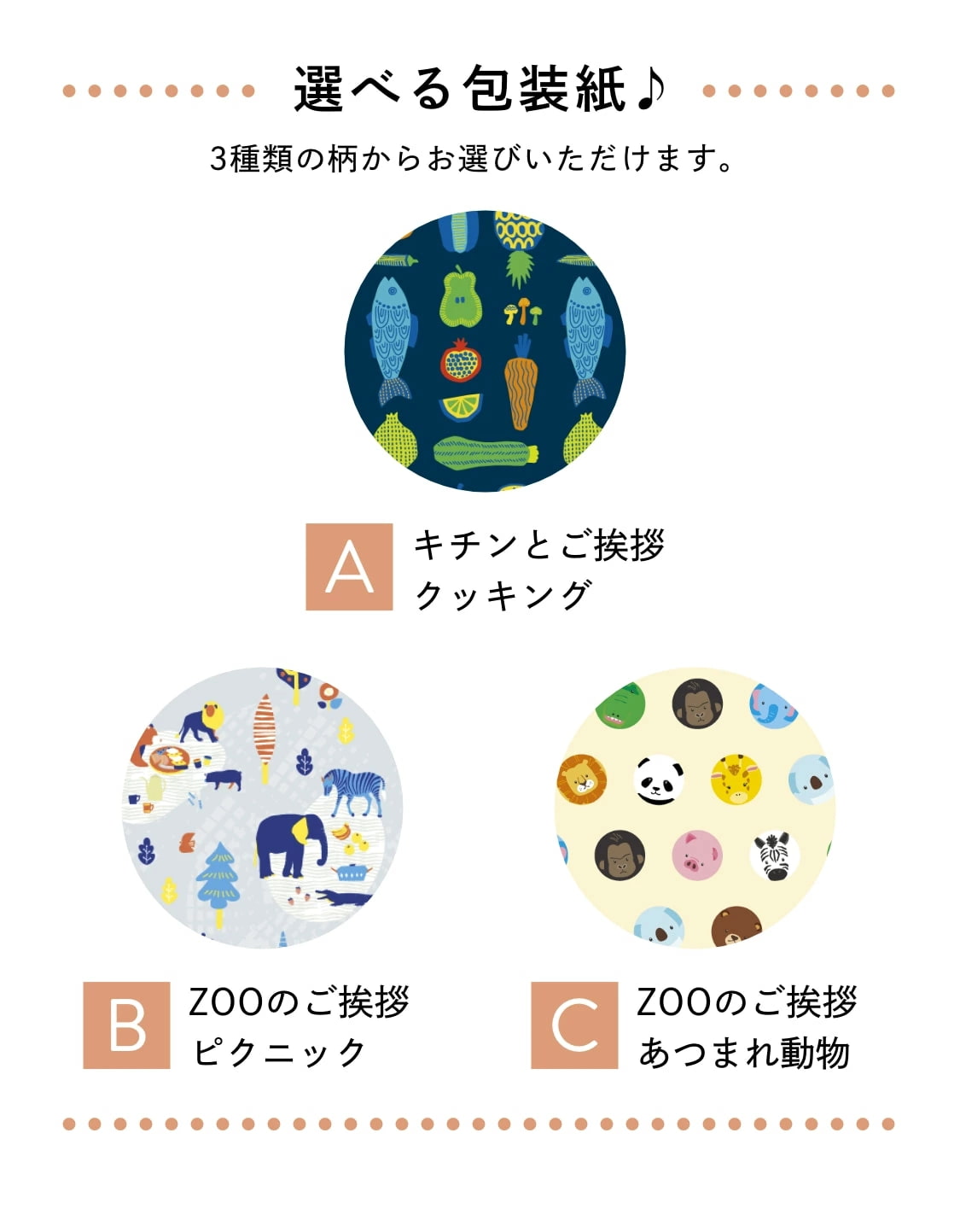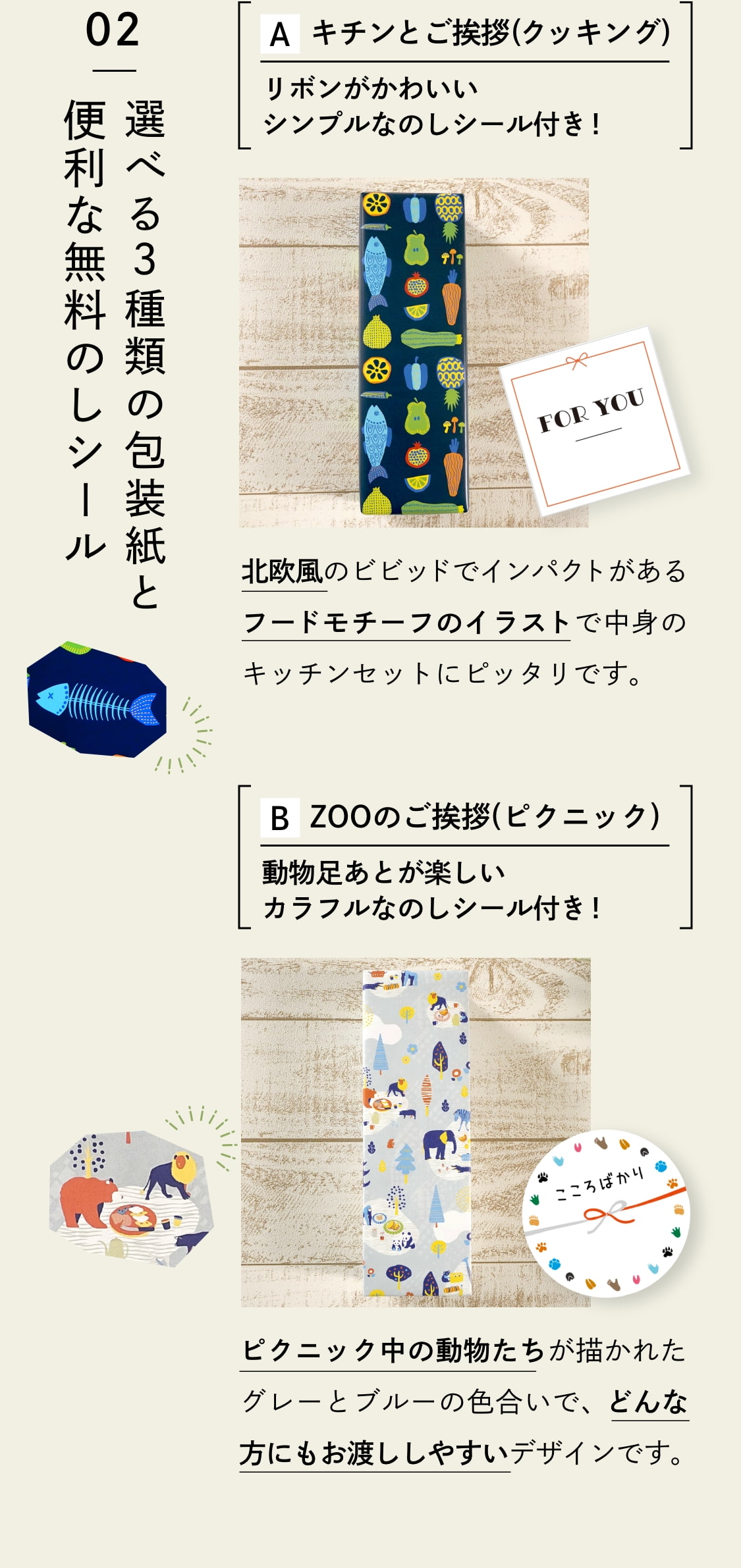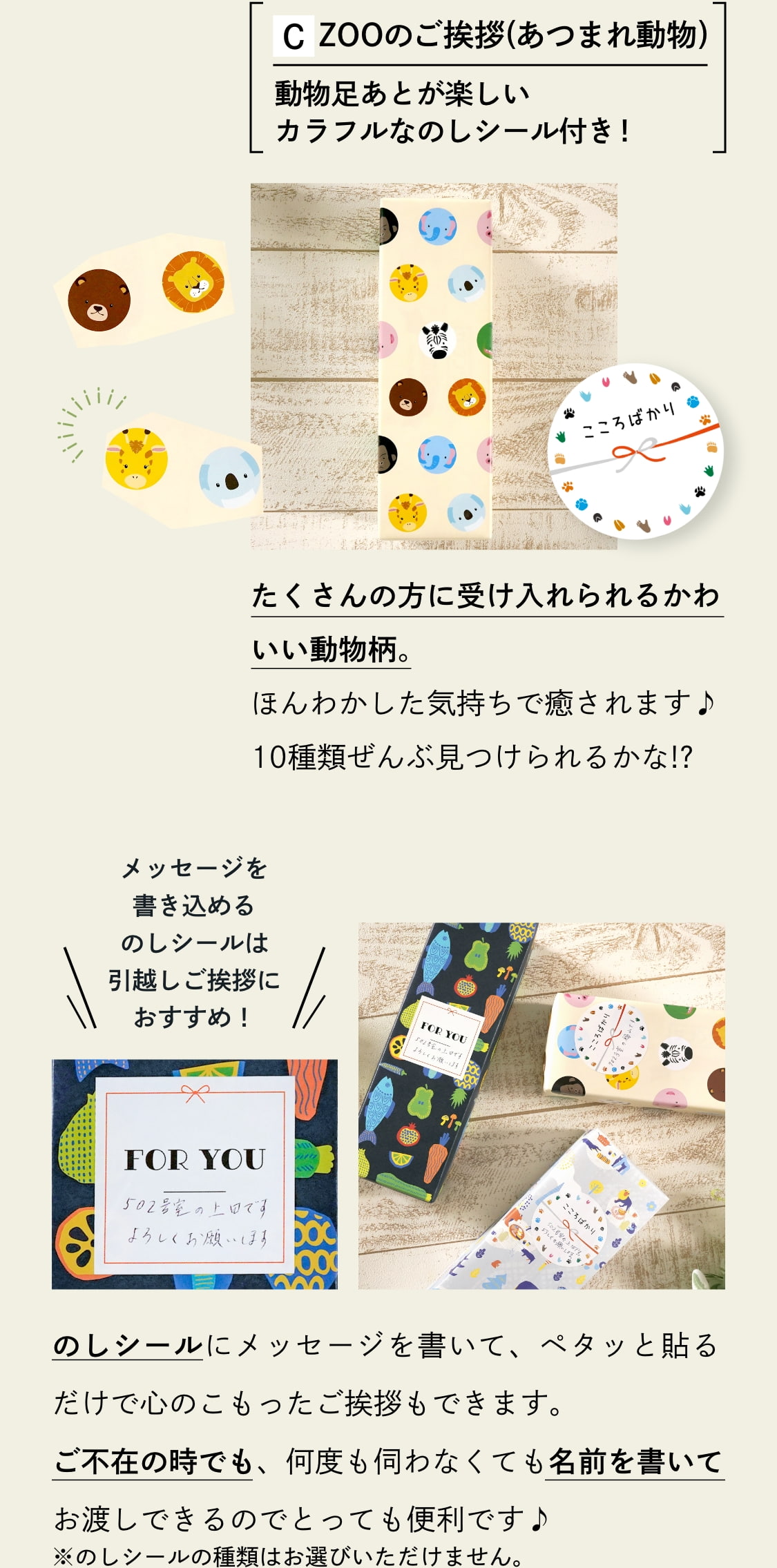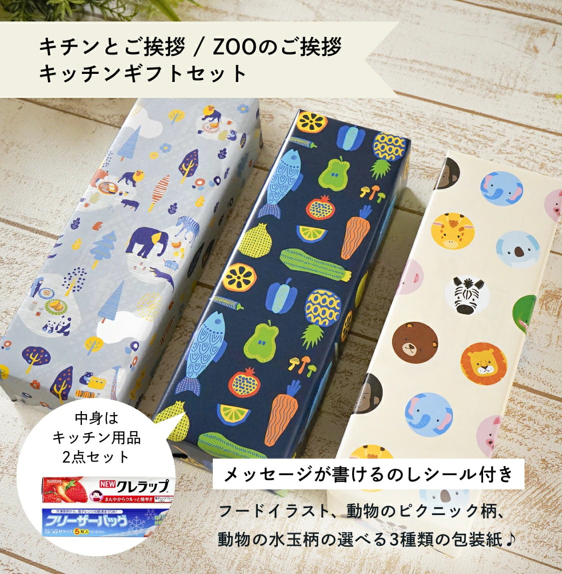 引っ越し挨拶の粗品、結婚式、イベントのノベルティー、展示会のプチギフト、会社イベントの賞品、ちょっとしたお返しギフトに迷っていませんか? 「お菓子だと好き嫌いやアレルギーが気になる」「豪華すぎて逆に相手が迷惑?」 「あまり費用をかけずに大勢に配りたい」と贈りものを選ぶときは悩みがたくさん。 「ZOOのご挨拶」でそんな悩みを解決!バラエティーギフトの箱のままだと渡すのに抵抗があるとの多くの声から、日用品として大人気のクレラップとフリーザーバッグのバラエティーギフトをかわいい動物の包装紙で包みました。さらに、かわいくメッセージも書ける熨斗シール付き!「可愛いデザインで挨拶に行くのが楽しみになった」「渡す時に話が弾んだ」とお喜びの声をいただいている人気ギフトです。