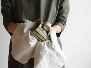 素材のリネンはさらっとしたさわり心地の透け感の無いしっかり目の生地を使用。リネンはコットンの4倍の吸水性を持ち、水分を素早く乾かせるのでカビや雑菌の繁殖を抑えてくれます。しかもリネンは水に濡れると強度が増すという特徴があり、気兼ねなくお洗濯できるのも◎。使うほど柔らかく手になじんでくる経年変化もお楽しみいただければ幸いです。日々の暮らしで使用するキッチンクロスにはぴったりな素材です。