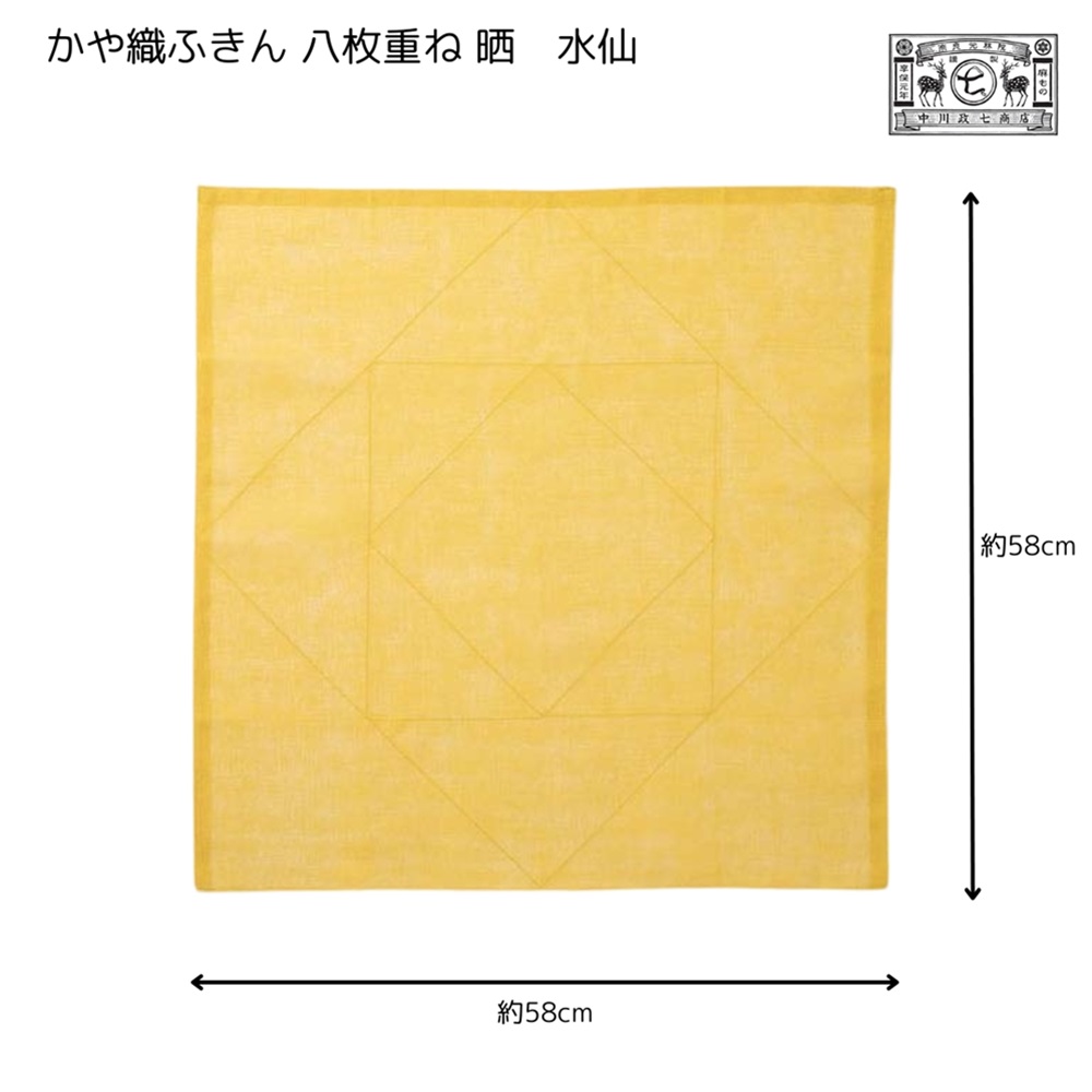 中川政七商店の「彩り豊かな」花ふきんは、300年の歴史を持つ奈良の老舗が誇る逸品です。白百合(シラユリ)、檜扇(ヒオウギ)、水仙(スイセン)、柳(ヤナギ)、竜胆(リンドウ)、小手毬(コデマリ)の6色展開で、どの色も日本の自然を思わせる優雅な色合いで仕立てられています。素材には、奈良県特産のかや織を採用し、2枚重ねることで吸水性と速乾性を高めました。約58cm×58cmの大判サイズは、折りたたんでふきんとして、広げて干すときの便利さを兼ね備えています。