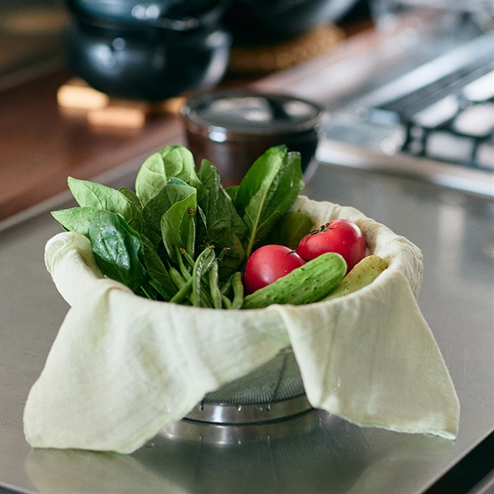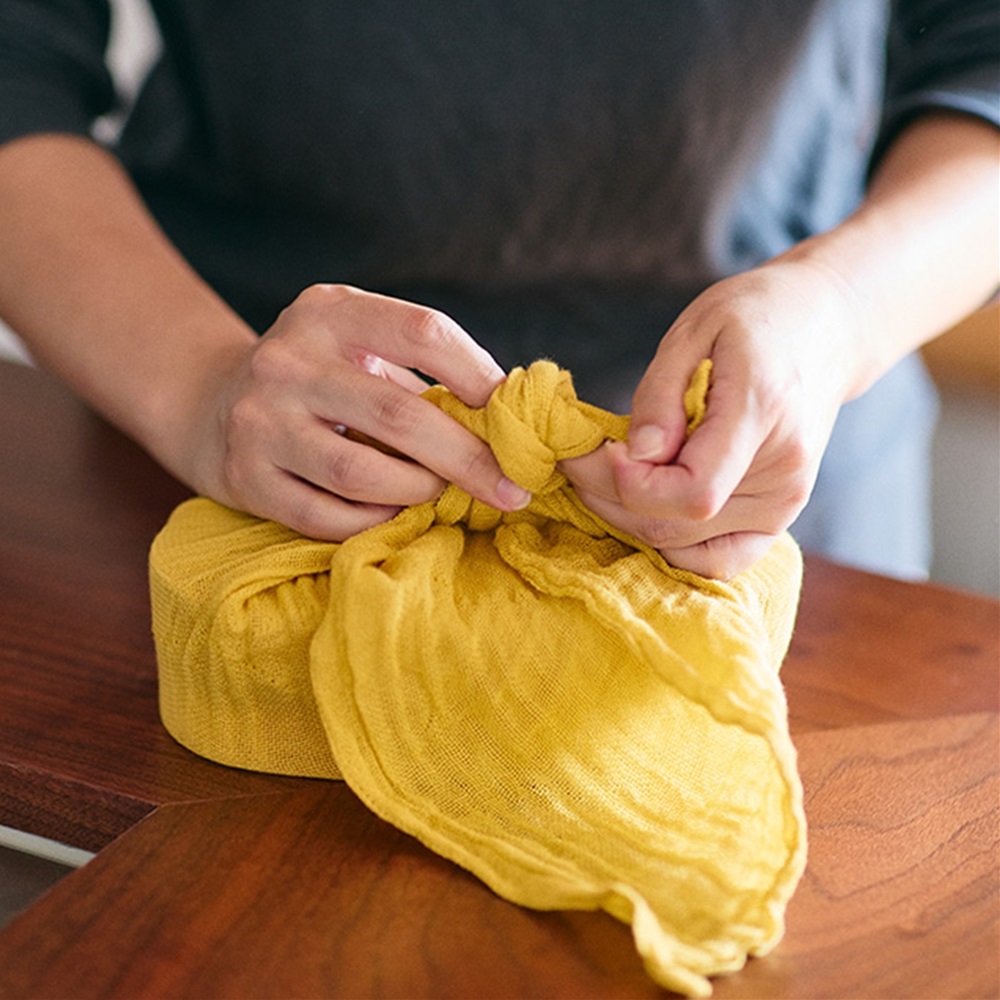 この花ふきんは、ふきんとしてだけでなく、お弁当包みや出汁漉し、野菜の水気取りなど、さまざまな用途で活躍します。天然繊維である綿100%を使用することで、洗うたびに柔らかく、優しい肌ざわりに変化し、長くご愛用いただけます。贈答品としてもふさわしい品のあるたとう紙が付属し、日常の中で特別な一瞬を演出します。