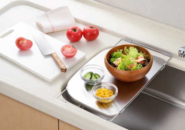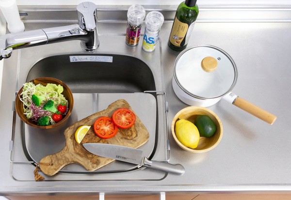 せまいキッチンだと、調理器具やお皿などで調理スペースがすぐにいっぱいになって作業しずらくなります。そんなときに便利なのがこのステンレストレーです。シンクの上に設置するだけで、天板とほぼ同じ高さの調理スペースを増やし、キッチンを広く使うことができます。