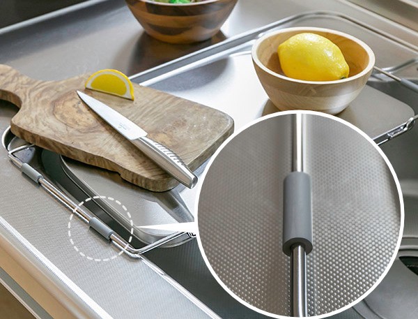 トレーには脚ゴムが4か所付いているので、設置した際にシンクを傷付けません。滑り止めの役割もあるので、まな板受けとしてトレーの上で調理をする際も横ズレするのを防いでくれます。