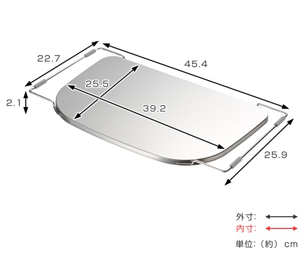 ステンレストレーは角丸形状なので、D型形状のシンクのコーナーにフィットします。使用可能なシンクの奥行内寸は、約39.5〜44cmです。(※トレーは伸縮しません)天板部分はフラットで汚れが溜まらず、いつも清潔に使えます。錆びに強いステンレス製で、水回りでの使用も安心してお使いいただます。