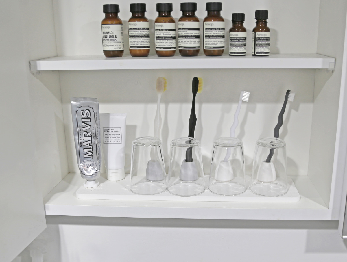 洗面台でコップや歯ブラシ、ハンドソープなどを置いて整頓すれば、水浸しになりがちな洗面台も見た目もすっきりとした綺麗な状態をキープできます。