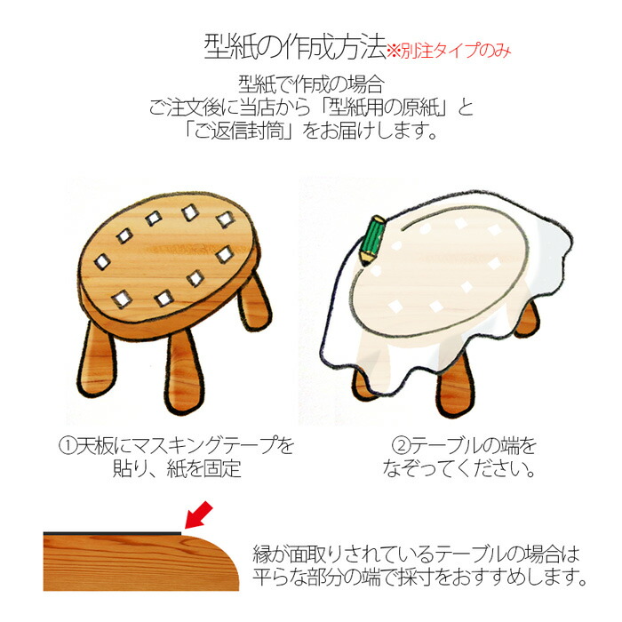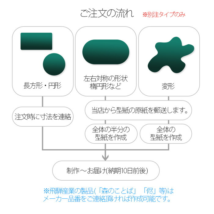 ※別注品は、上記サイズ範囲内で自由に作成可能です。型紙作成の場合、詳しくは別注テーブルマットのご注文方法をご覧下さい。
