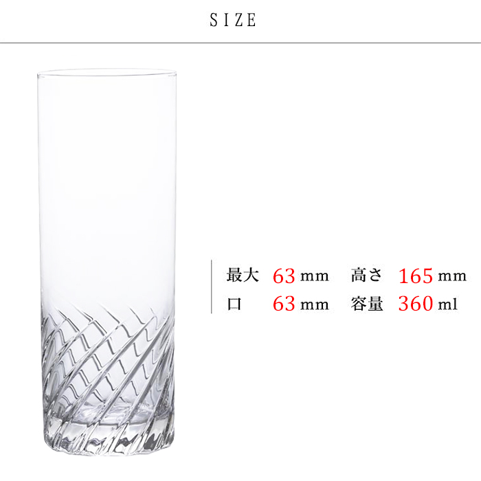満水容量は360ml。その形状からアルコールドリンクに使われることが多く、主にカクテル、モヒート、ハイボールグラスなどとしてご使用頂くことができます。
