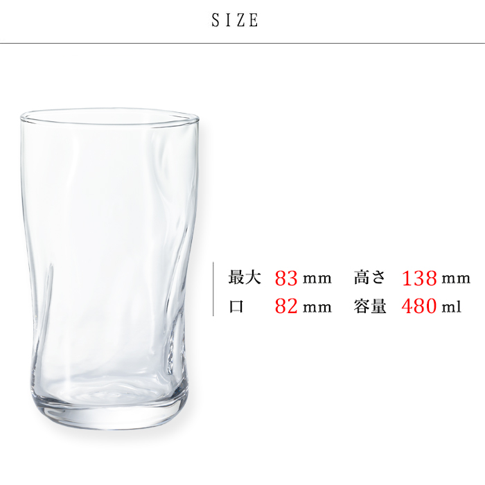 満水容量は約480mlですので、グラスとしては大きいサイズになります。氷をたくさん入れて飲むドリンクに適しており、お酒の場合は、水割り、ハイボール、チューハイがぴったりです。ソフトドリンクではほぼ全てのドリンクに合います。