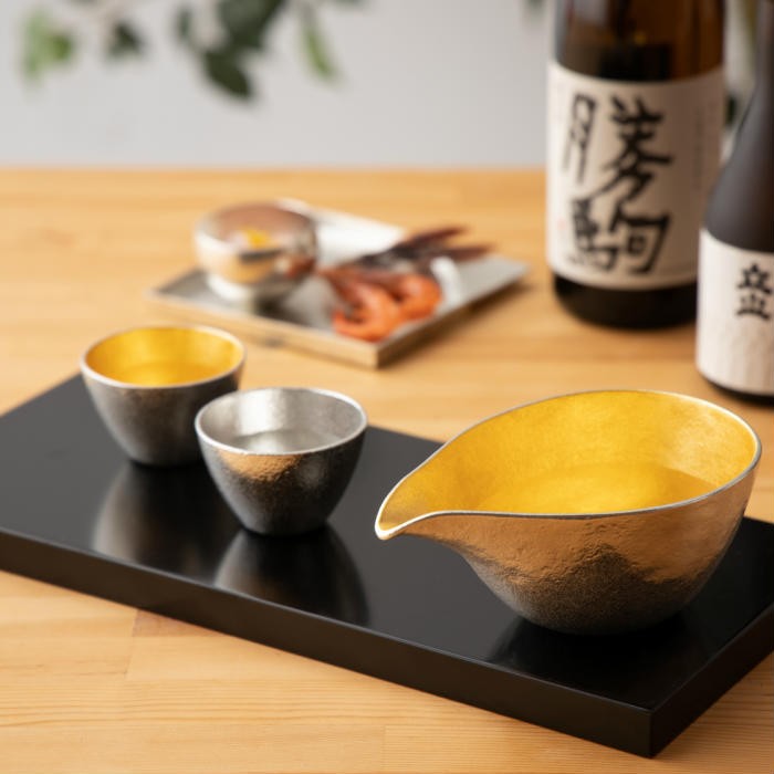 錫は古来より、「錫の器に入れた水は腐らない」、「お酒の雑味が抜けて美味しくなる」などといわれ、酒器や茶器などに用いられてきた金属。金箔は全国シェア99%を占める金沢のものを使用しています。