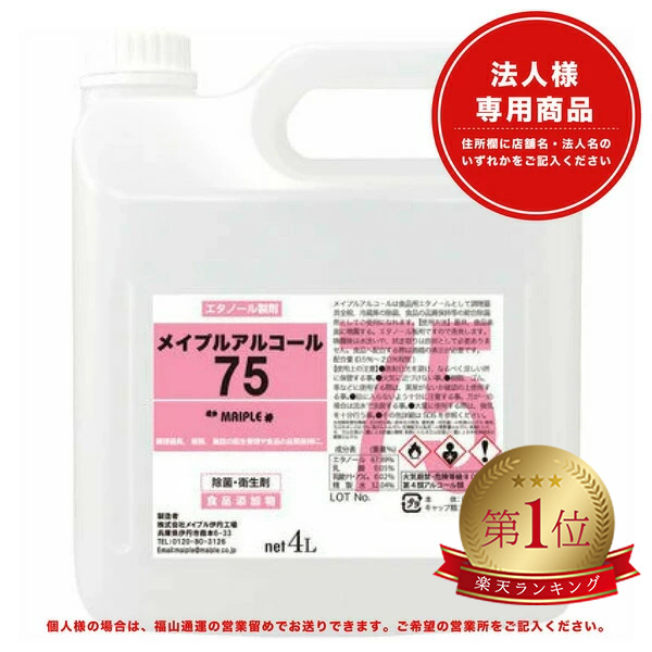 メイプルアルコール75 4L アルコール75% 介護 オフィス 厨房 ウイルス 業務用 手指 感染症対策 高濃度 除菌