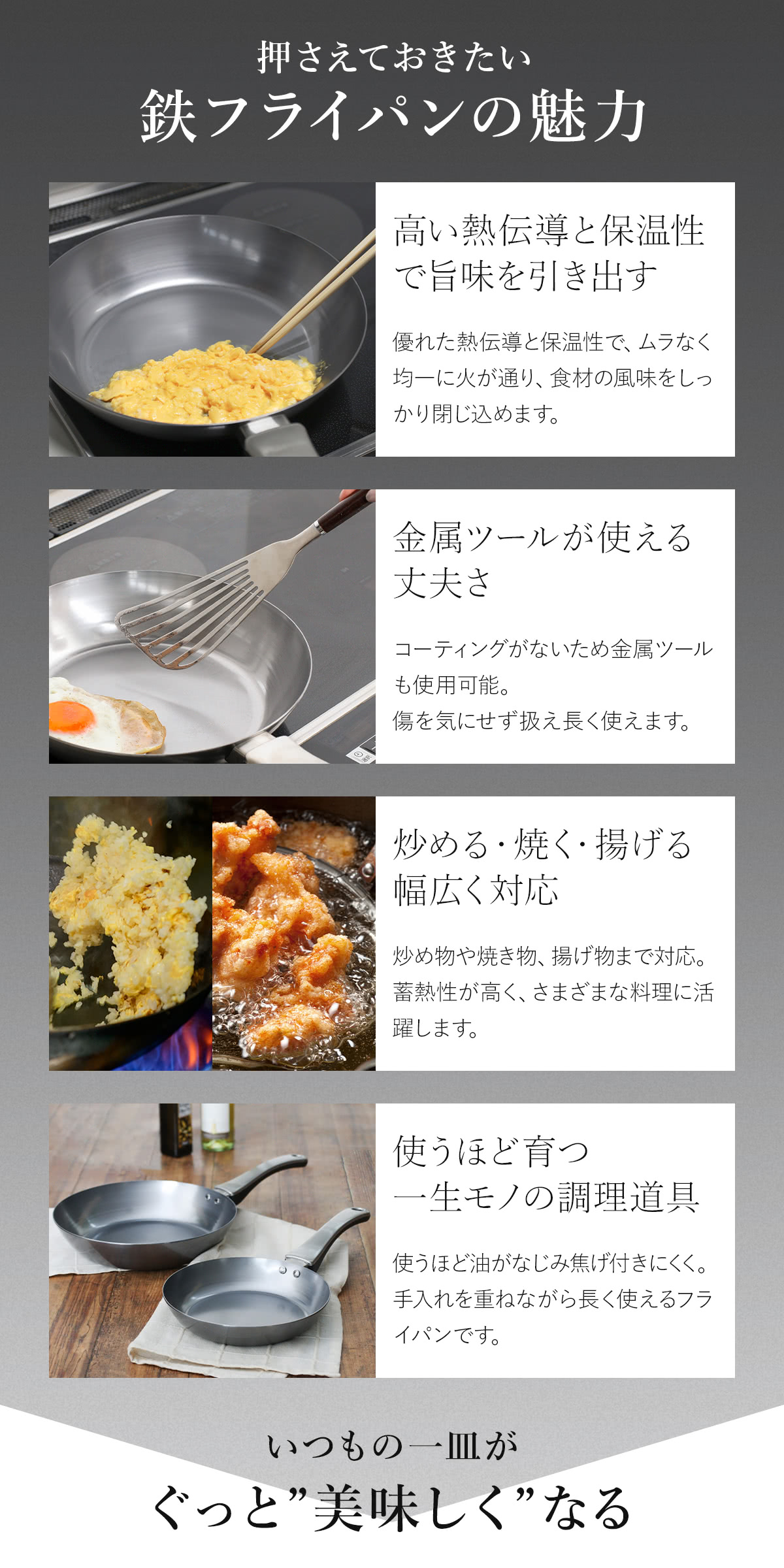 20センチ 26センチ 鉄のフライパン 鉄製 金属ヘラOK いため鍋 浅型フライパン 調理器具 鉄製調理器具 炒め物 ihOK IH使える ガスOK 直火OK 熱伝導 初心者 新生活 新生活準備 人気 便利 おすすめ 国産 調理用品 料理道具 台所用品 調理小物 キッチングッズ LH16236