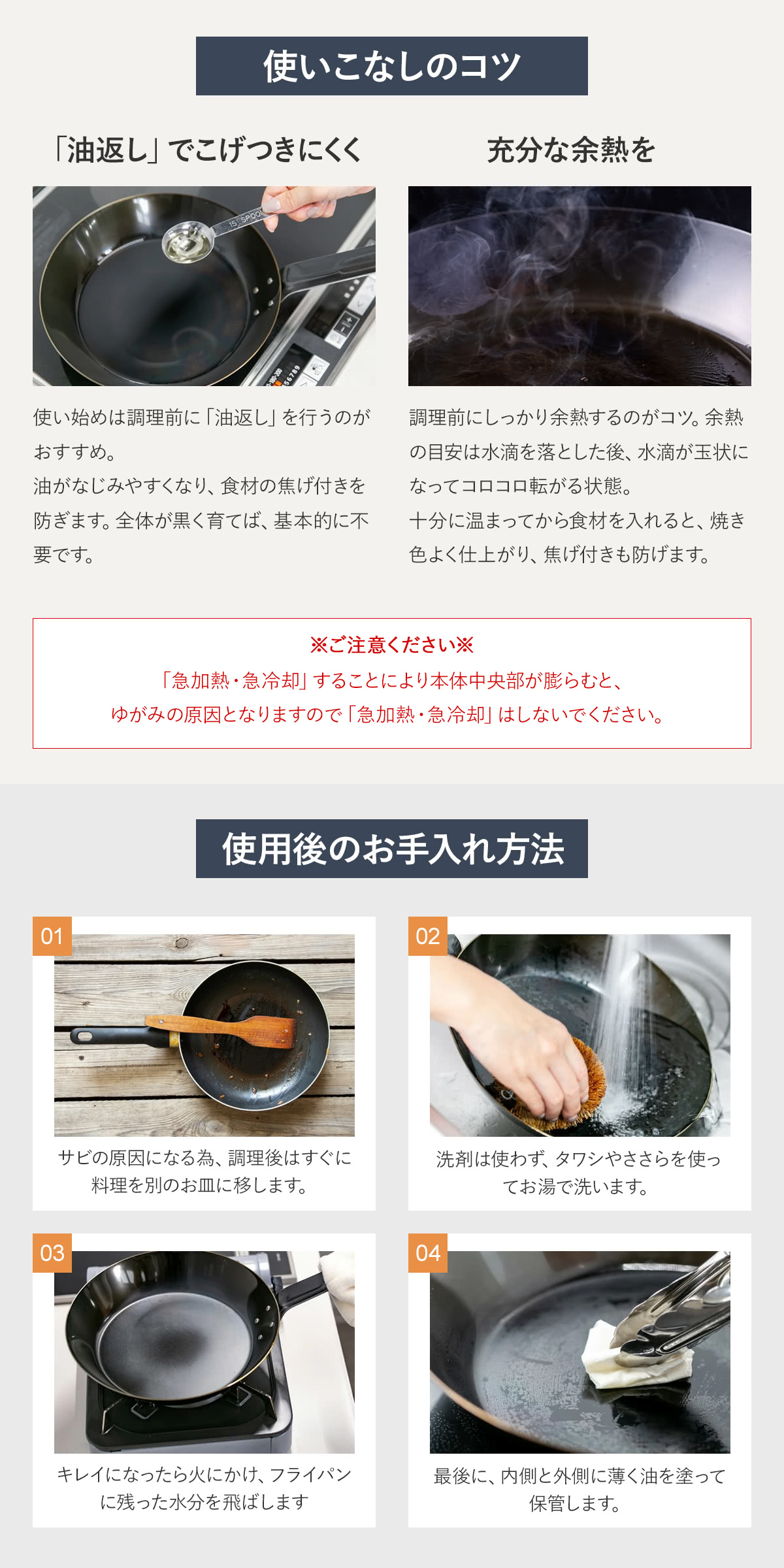 ●使い込めば使い込むほど油なじみが良く、焦げ付きにくくなります。