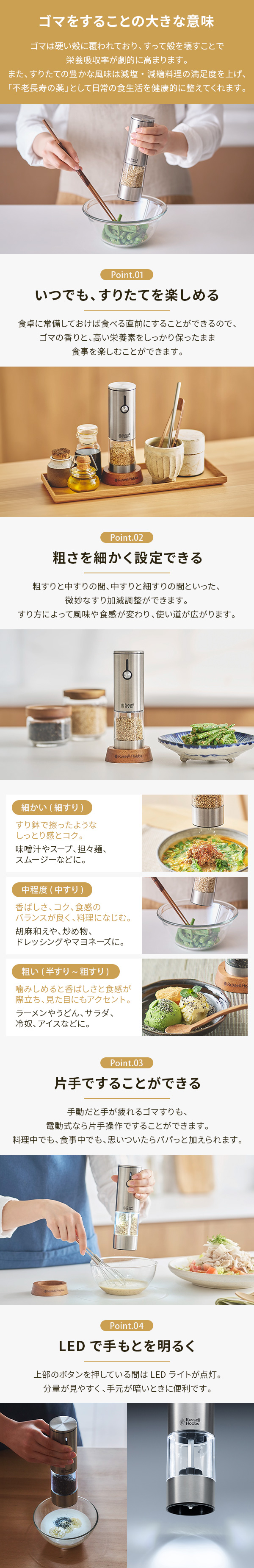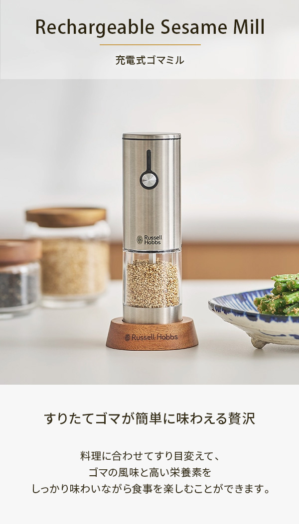 一方、ゴマはすった時点からの酸化によって、味も栄養価も速いスピードで落ちていきます。ラッセルホブスの「充電式ゴマミル」を食卓に常備しておけば、食べる直前にすることができるので、ゴマの香りと高い栄養素をしっかり味わいながら食事を楽しむことができます。