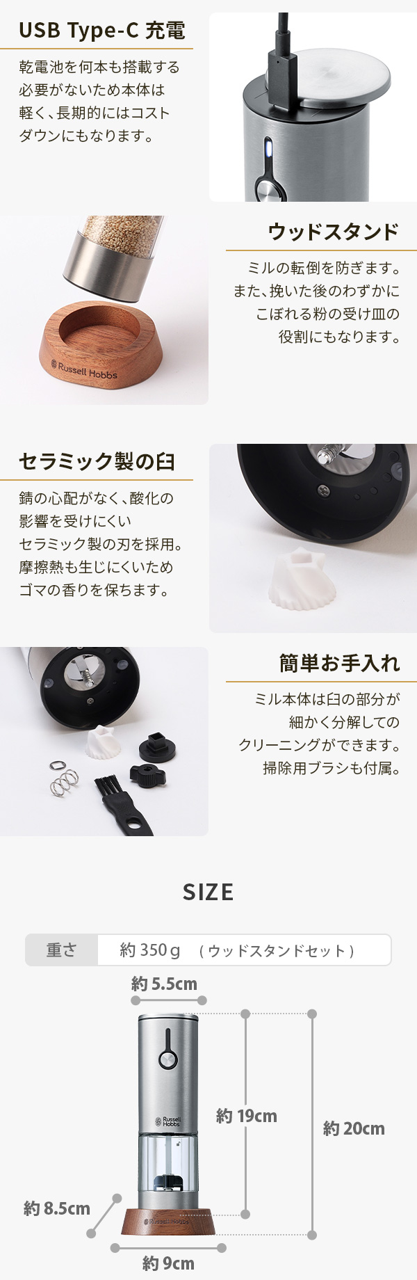 錆の心配がなく、酸化の影響を受けにくいセラミック製の刃を採用。摩擦熱も生じにくいため、熱で飛びやすいゴマの香りを保ちます。