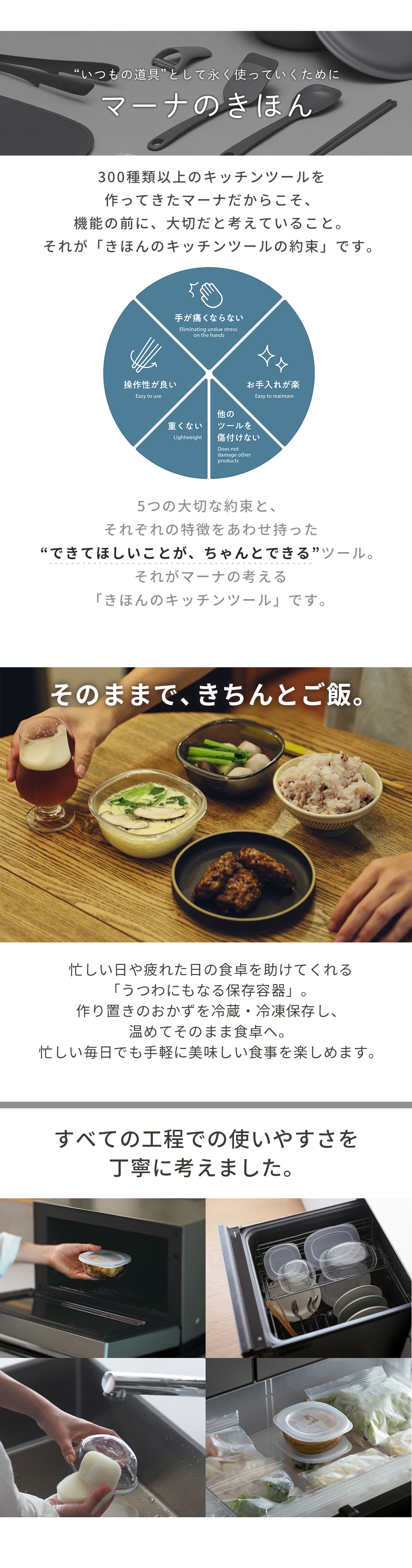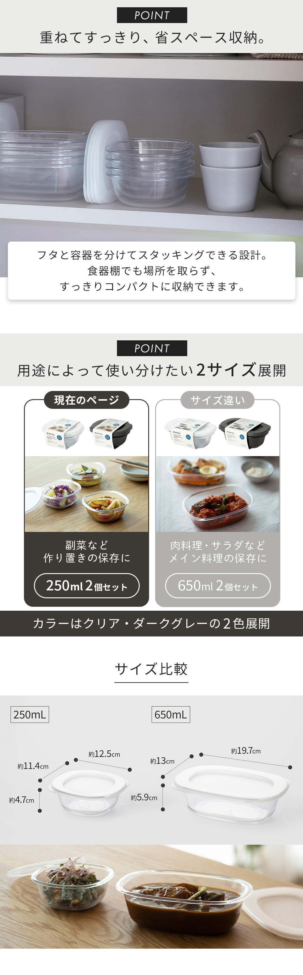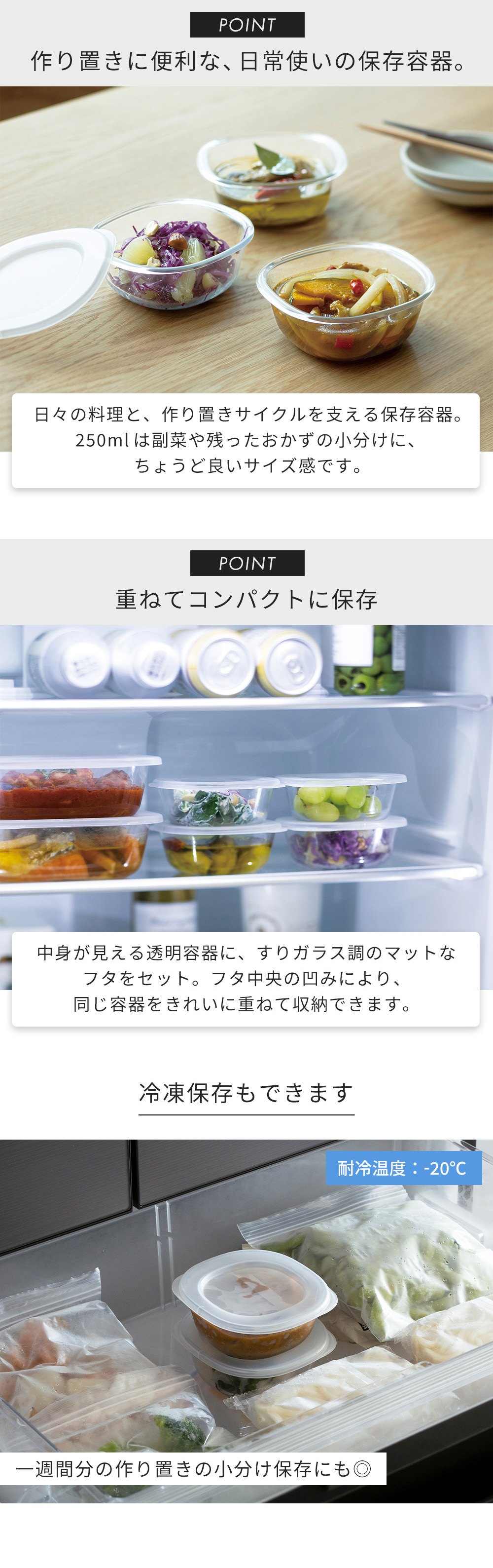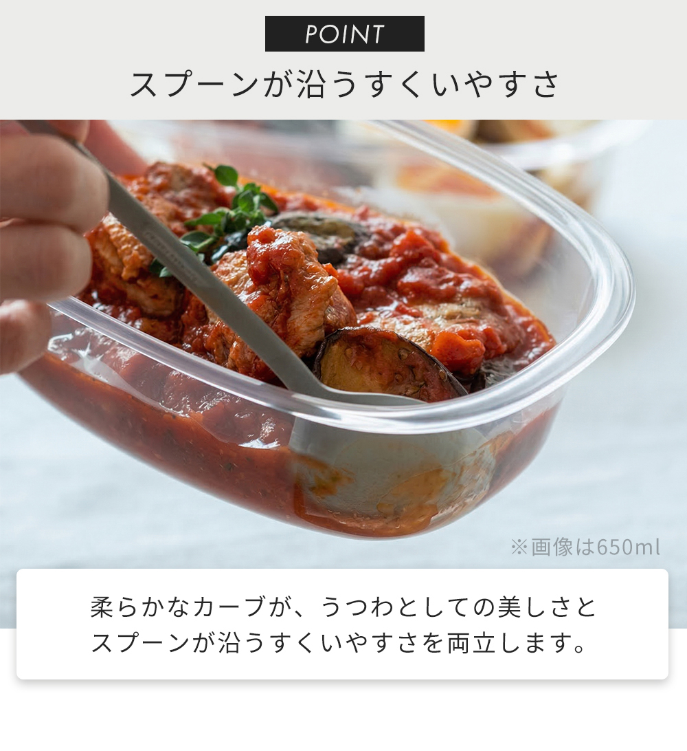さっと温めて、そのまま食卓へ。保存から食卓、片付けまでスムーズに使える、毎日使いの保存容器。副菜の作り置きや残り物を入れるのにちょうどいい250mLサイズです。