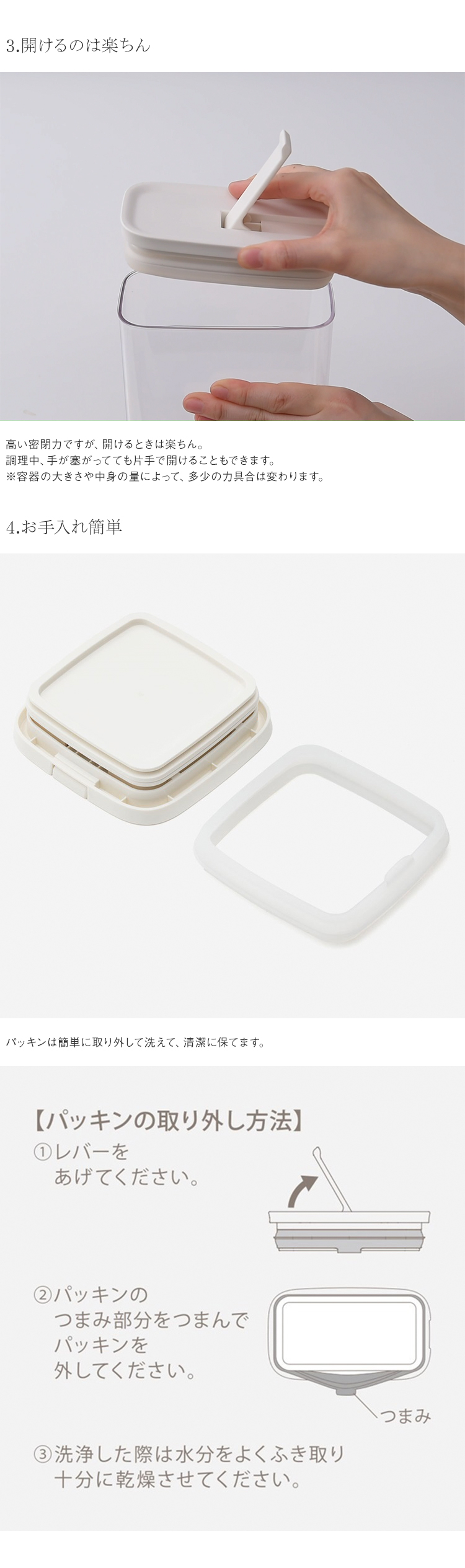 密閉性を高くするレバー式の保存容器です。ロック時は、しっかりとフタが嵌っていますが、レバーを上げてオープンする際は、軽い力でサッとフタを持ち上げることができるので、操作が簡単です。