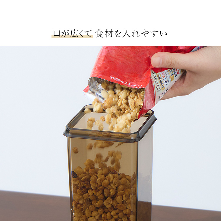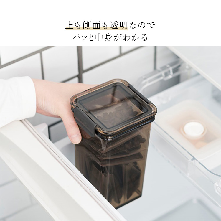 横からだけでなく上からも中身が見え、四角形状なので冷蔵庫収納時もすっきり。