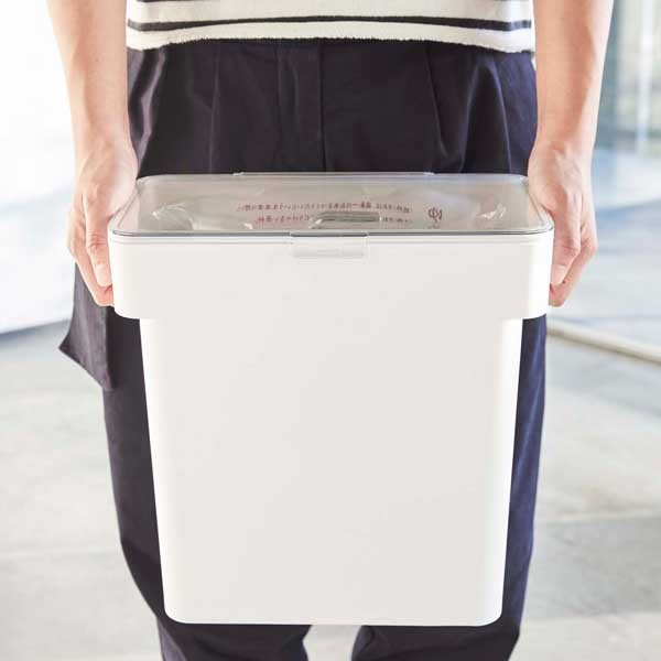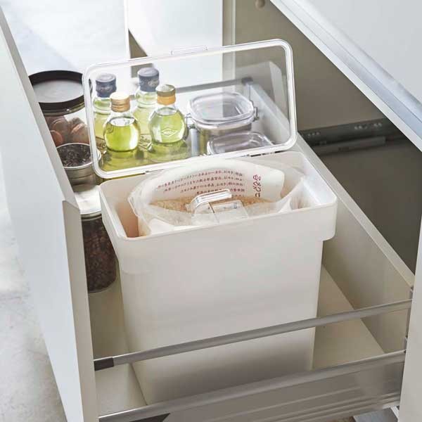 山崎実業の人気シリーズ「tower」の米びつです。モノトーンなデザインの「towerシリーズ」からは、アイデアを詰め込んだ日用雑貨が数多く生まれていて、統一感もあり非常に人気があります。5kg用のお米を袋ごと入れて保存ができます。パッキンでしっかり密閉されたスタイリッシュなデザインで、蓋をしっかりロックしておけば、お米を湿気と酸化から防いでくれます。蓋は全面が開くのでお米がすくいやすく、透明なので残量が分かりやすいです。シンク下の引出しにも収納できる大きさです。持ち手があるので、お米を入れる際に移動するのも簡単です。段差メモリで一目で量が分かる計量カップも付いています。