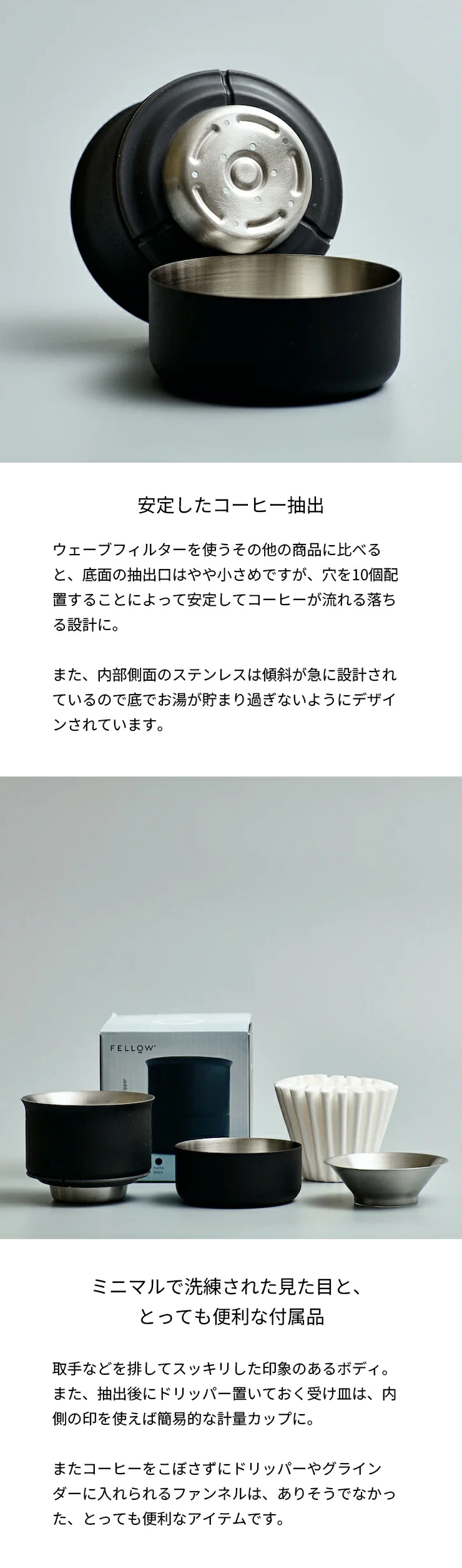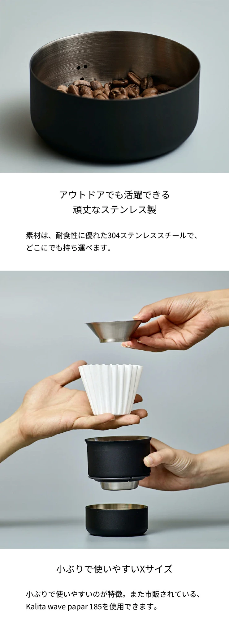 取手などを排してスッキリした印象のあるボディ。また、抽出後にドリッパー置いておく受け皿は、内側の印を使えば簡易的な計量カップに。またコーヒーをこぼさずにドリッパーやグラインダーに入れれるファンネルは、ありそうでなかった、とっても便利なアイテムです。
