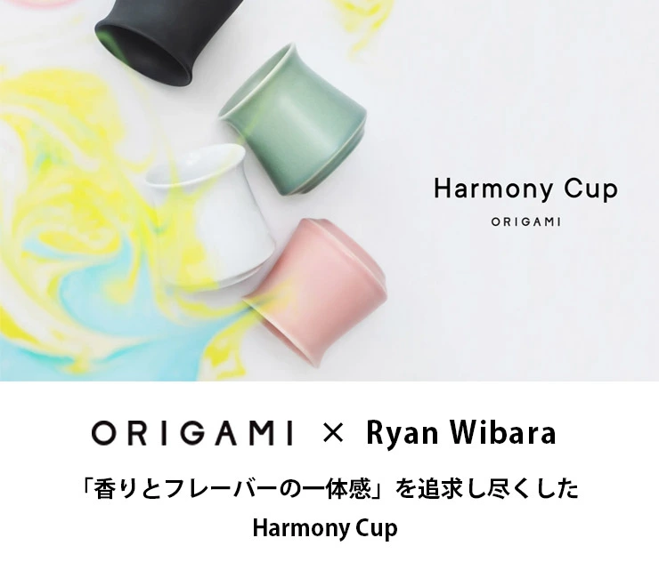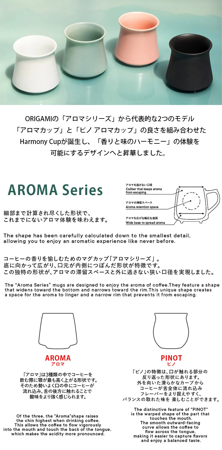 ハーモニーカップの基本シェイプは、ORIGAMI「AROMA Series(アロマシリーズ)」の構造をベースとし、コーヒーの香りをしっかりと閉じ込め、飲む際に香りが豊かに広がるように設計されています。スぺシャルティコーヒーの複雑でフルーティなアロマが、カップを持ち上けた瞬間に鼻腔を満たし、飲む前から味わいを深く感じることができます。この香りの保有力は、カップ内で極限まで香りが逃げにくいデザインだからこそ叶う演出で、最後の一口まで香りと温かさを保つことでコーヒーの魅力を余すことなく楽しむことが可能です。