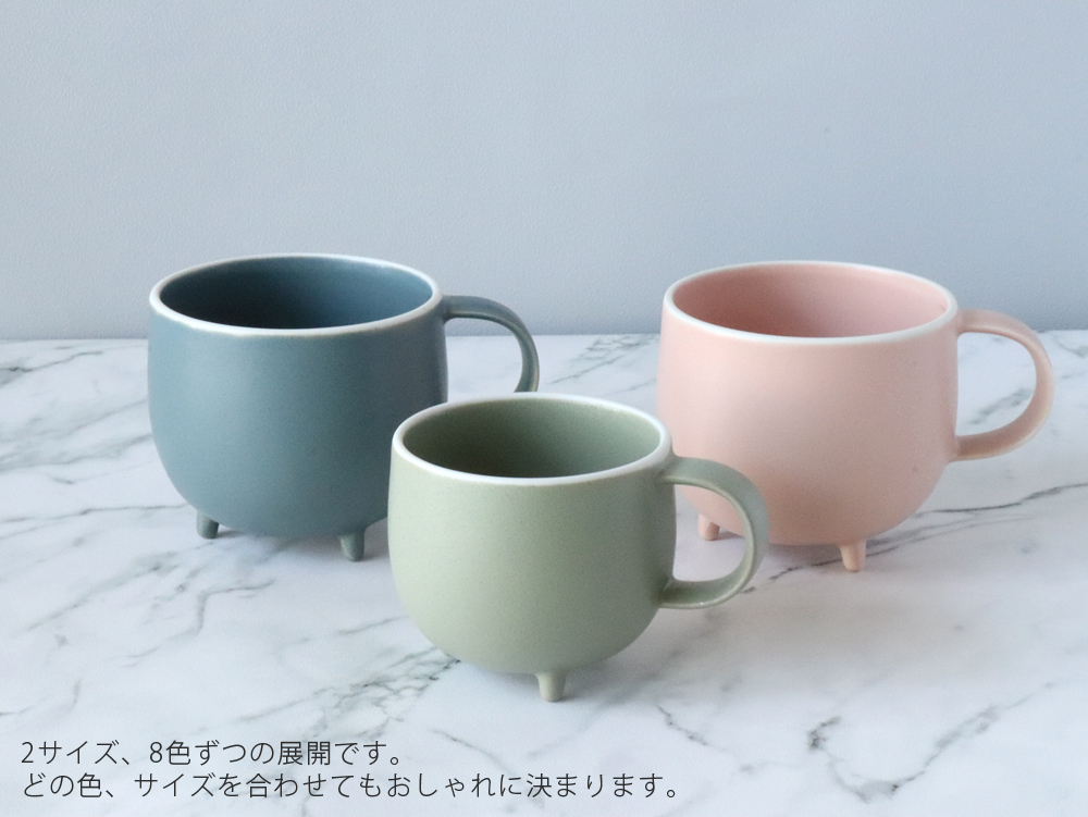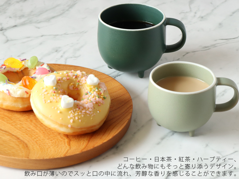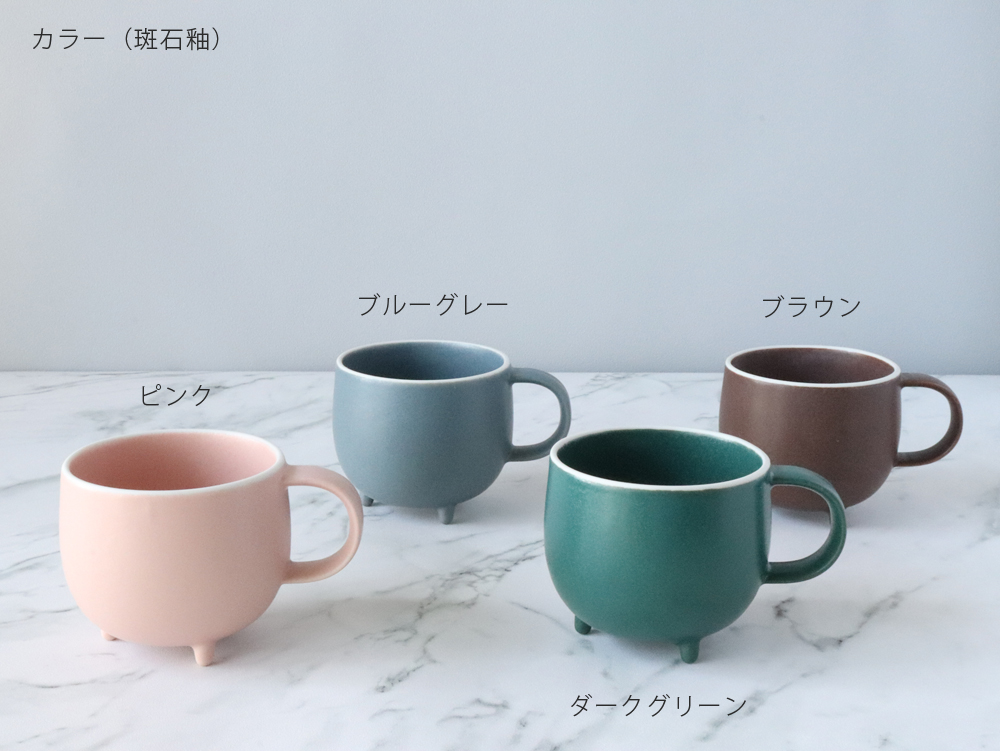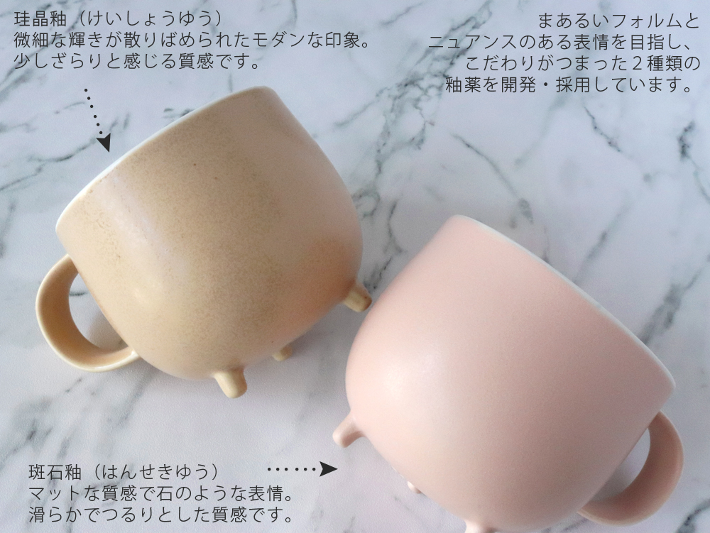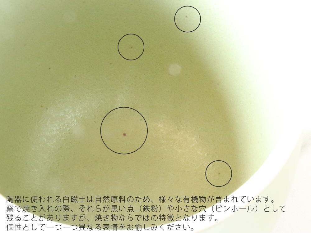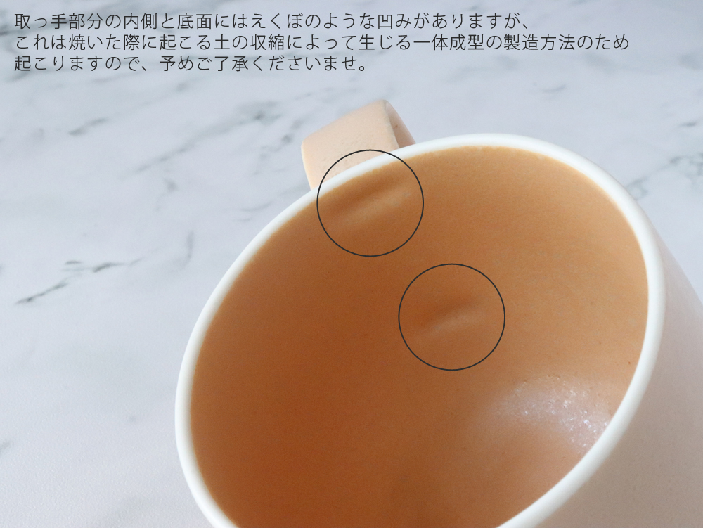 ●マグカップ内側(持ち手の付けている位置)に2つのえくぼ(凹)がございます。「ガバ鋳込み」により土が起こす成形収縮によって生じる窪みで、品質には問題ございません。愛嬌ある表情としてお楽しみください。