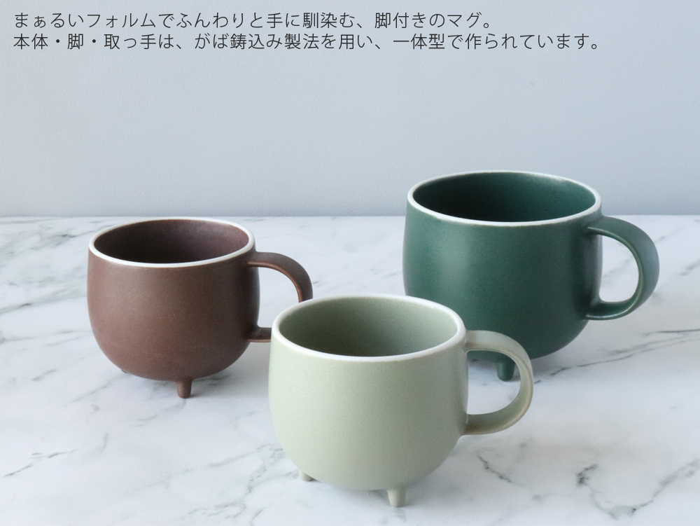 まあるいカップを支える3つの脚、持ち手はしっぽのようにも見え、今にも動き出しそうなフォルムのマグカップが届きました。