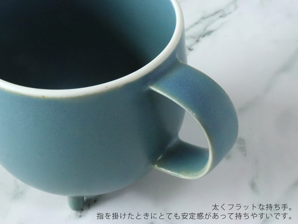 この頼りない3本脚さん、不思議と安定感がありますし、太めのフラットな持ち手は、とても持ちやすく飲み物が飲みやすい!よく考えられたデザインになっています。